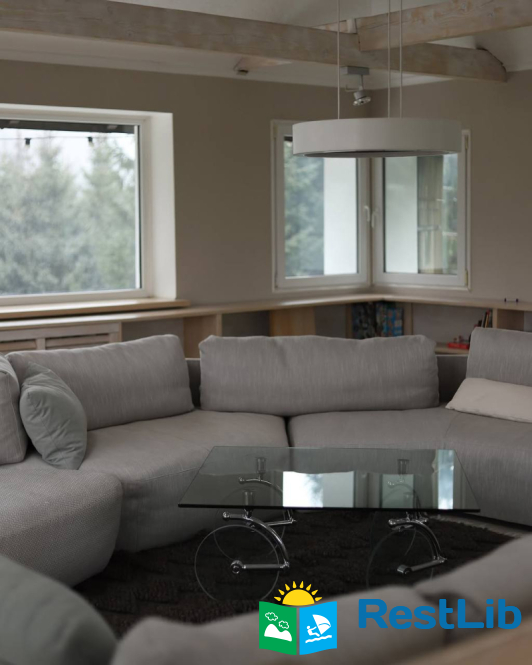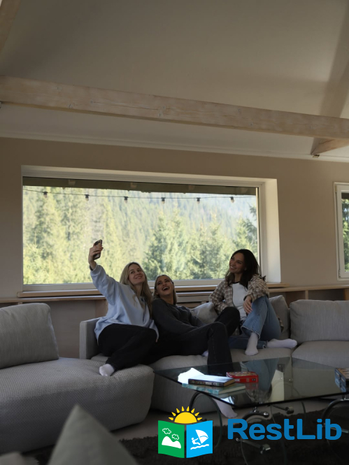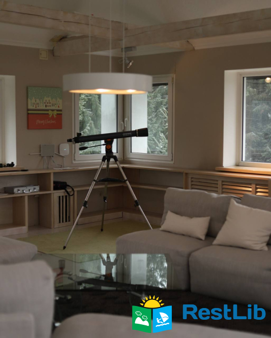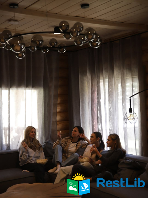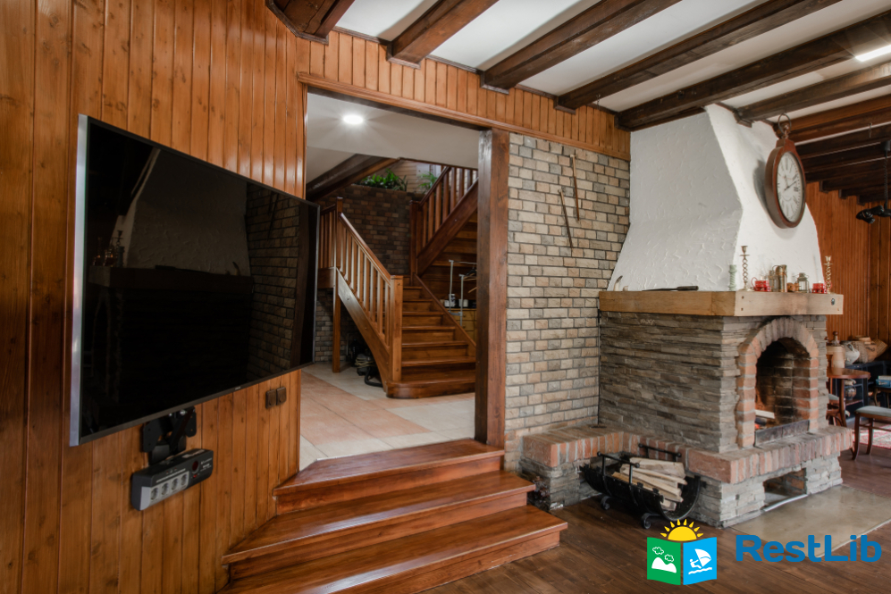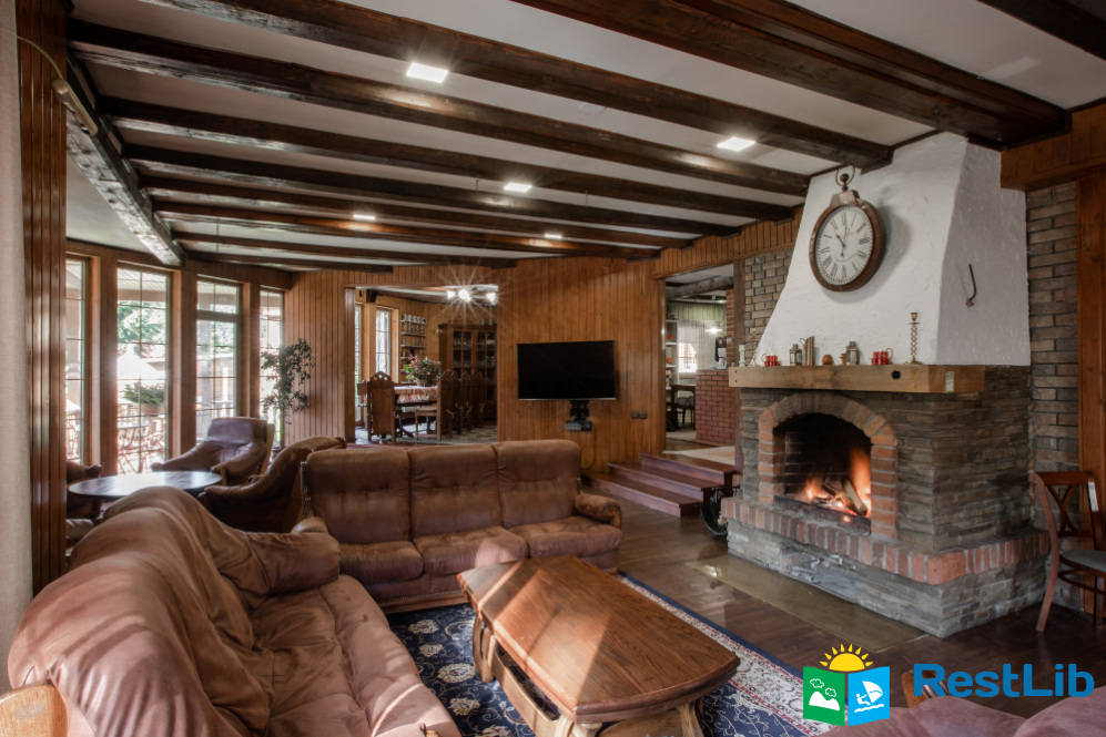 • простора вітальня з каміном, великим телевізором та зоною відпочинку, кухнею, террасою;