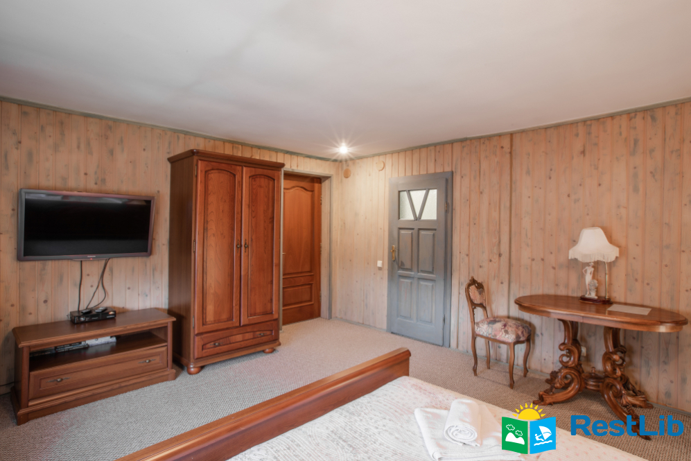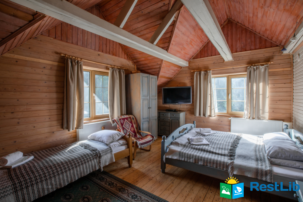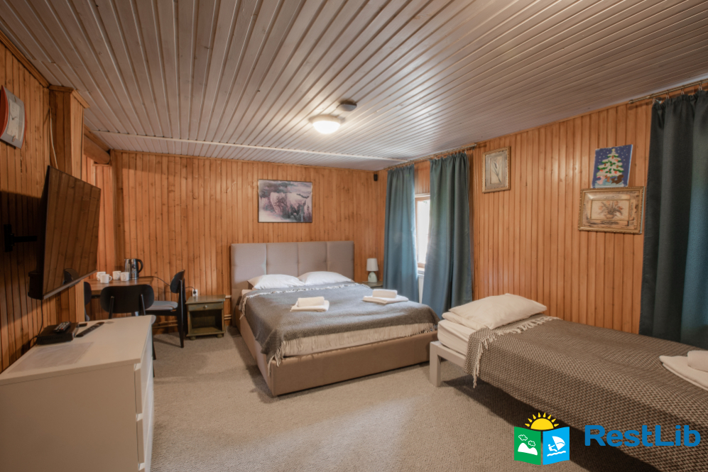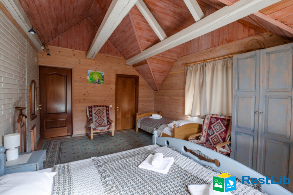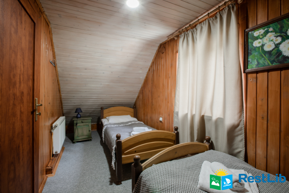 - На другому поверсі - двокімнатний номер (двоспальне ліжко, 2 односпальні ліжка, вішалка для одягу, в одній є телевізор, санвузол - душова кабіна, туалет, умивальник).