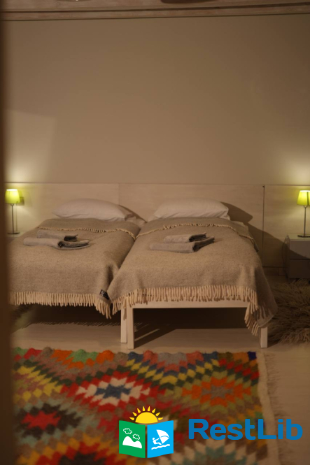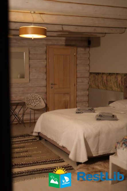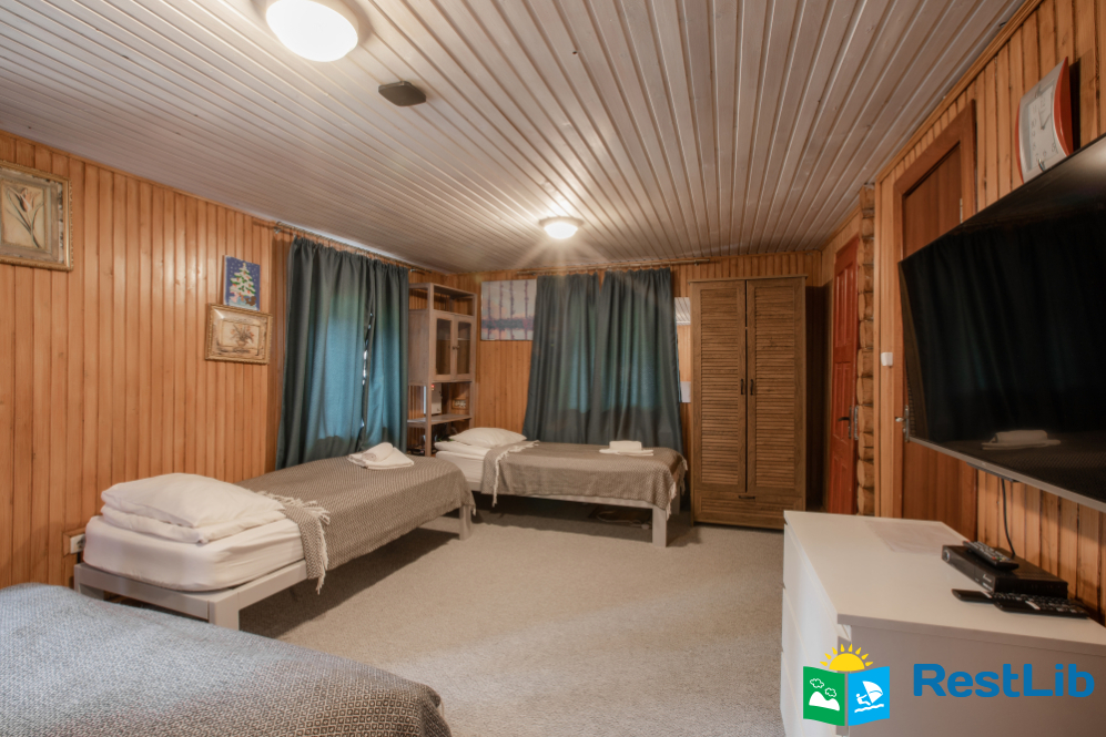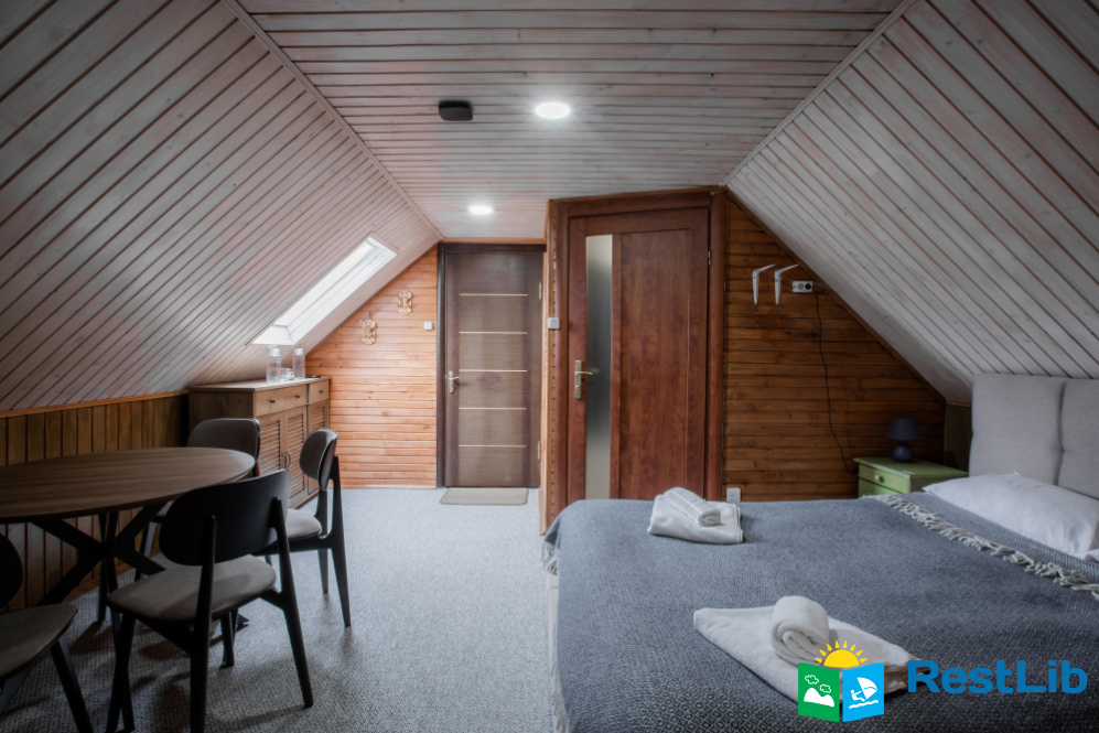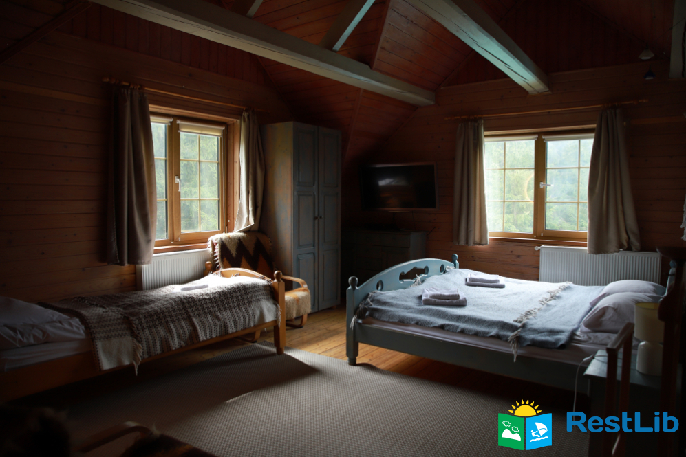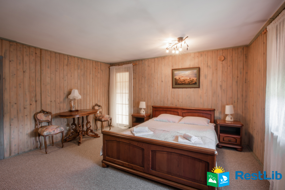 - На другому поверсі - двокімнатний номер (двоспальне ліжко, 2 односпальні ліжка, вішалка для одягу, в одній є телевізор, санвузол - душова кабіна, туалет, умивальник).