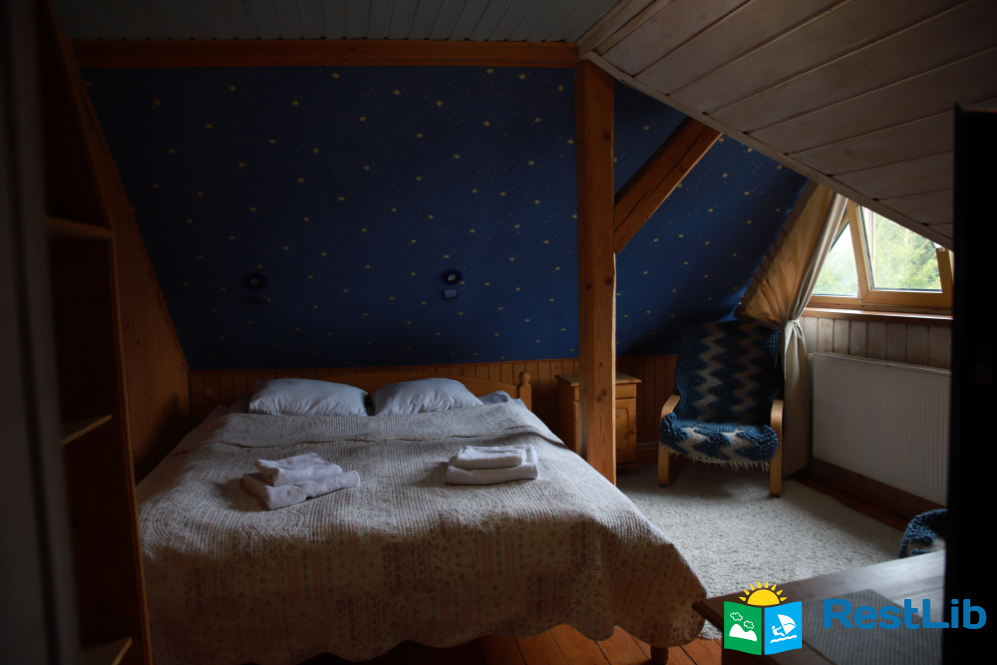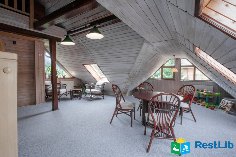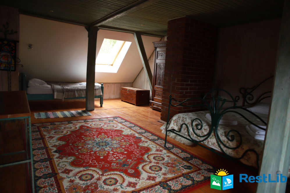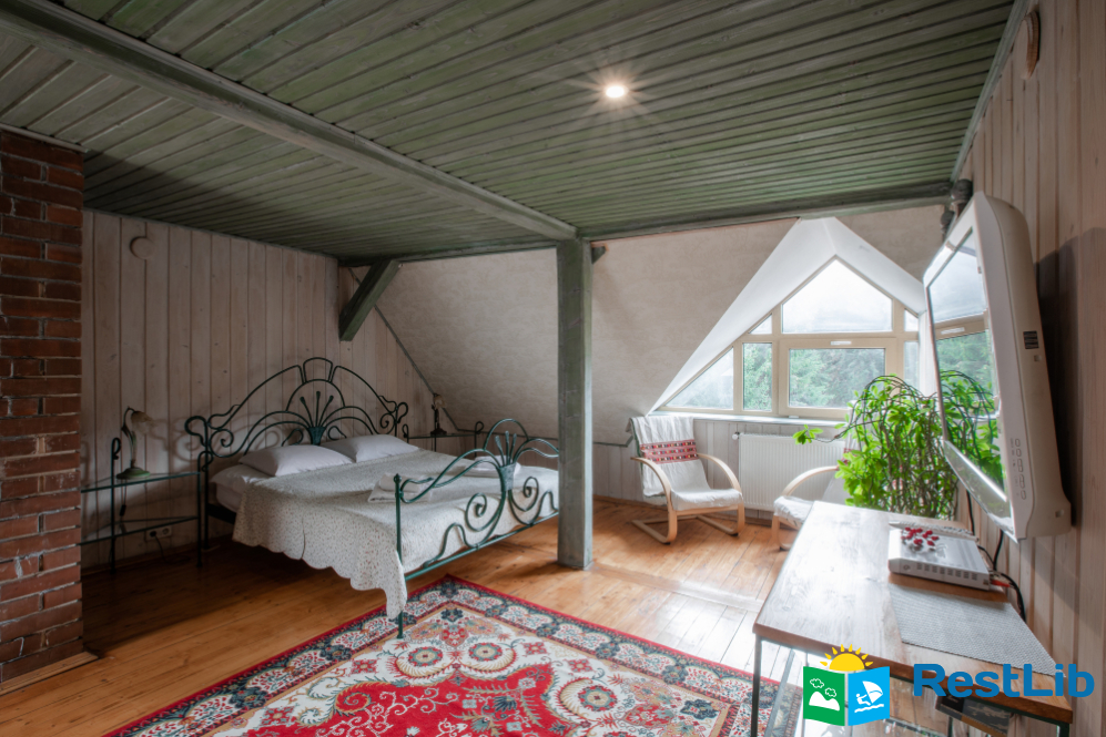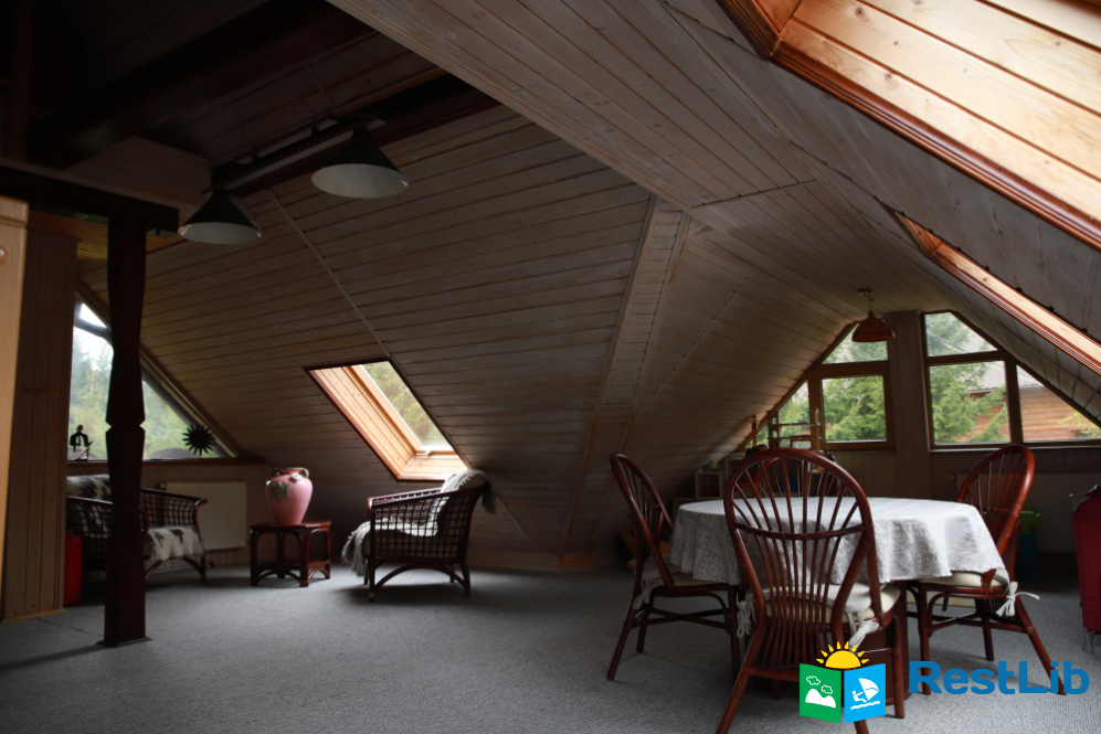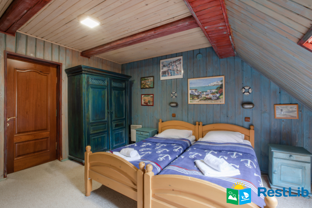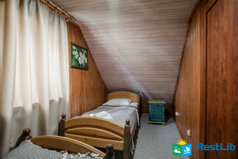 - На другому поверсі - вітальня з дитячою зоною; 4 двомісні номери (у кожному - двоспальне ліжко або 2 односпальні ліжка, шафа для одягу, телевізор, санвузол - душова кабіна, туалет, умивальник); санвузол (душова кабіна, туалет, умивальник). В одній кімнаті є додаткове місце - односпальне ліжко.