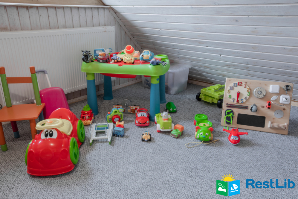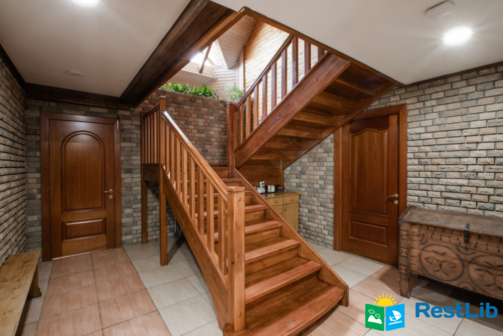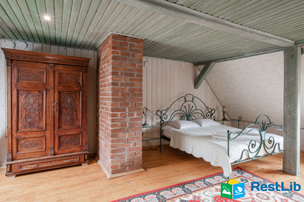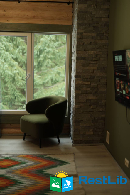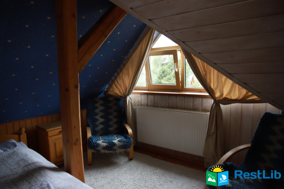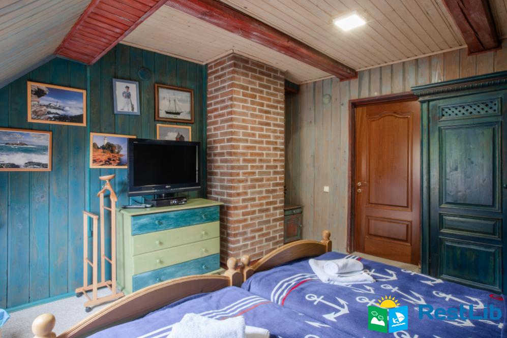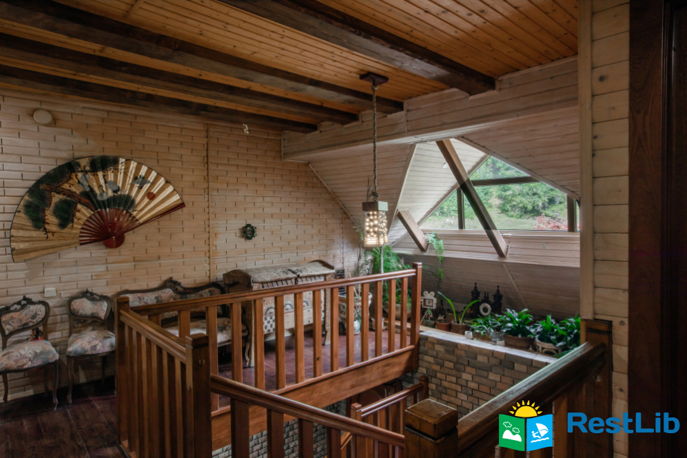 - На другому поверсі - вітальня з дитячою зоною; 4 двомісні номери (у кожному - двоспальне ліжко або 2 односпальні ліжка, шафа для одягу, телевізор, санвузол - душова кабіна, туалет, умивальник); санвузол (душова кабіна, туалет, умивальник). В одній кімнаті є додаткове місце - односпальне ліжко.
