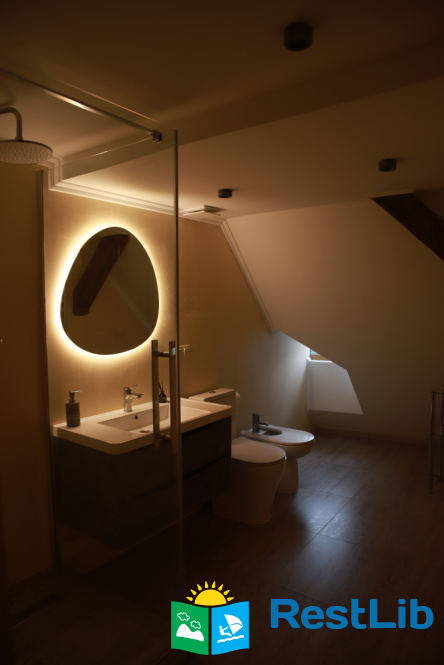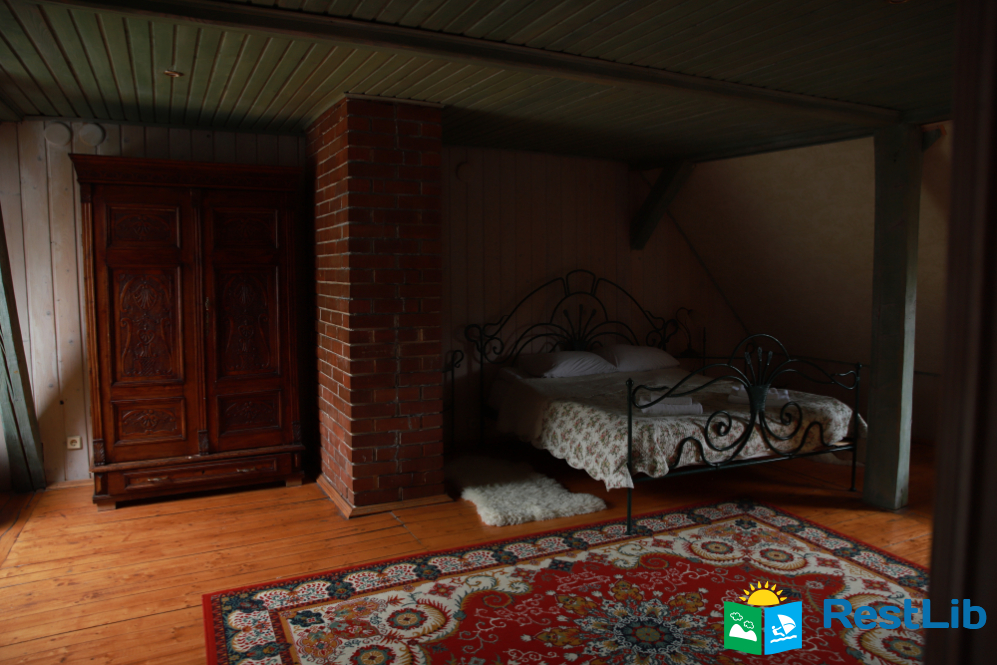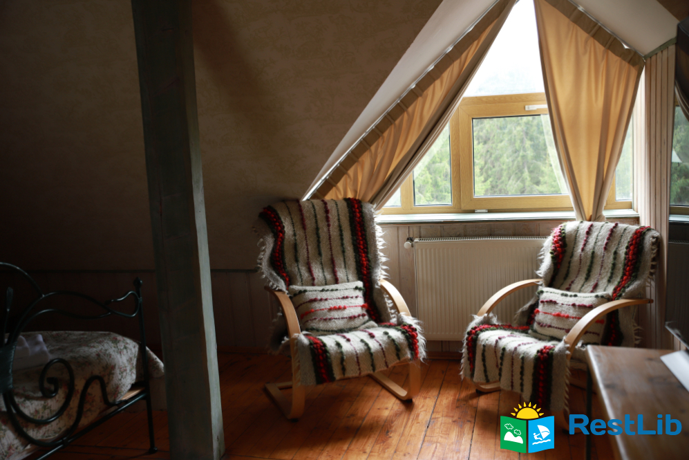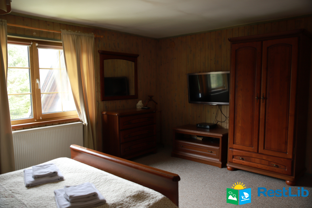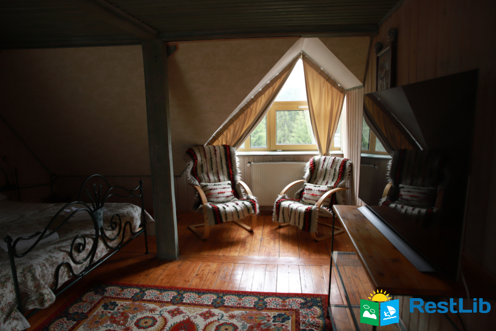 - На третьому поверсі - 2 двомісні номери (у кожному - двоспальне ліжко, шафа для одягу, телевізор, в одній кімнаті є додаткове місце - односпальне ліжко); загальний санвузол (душова кабіна, туалет, біде, умивальник).