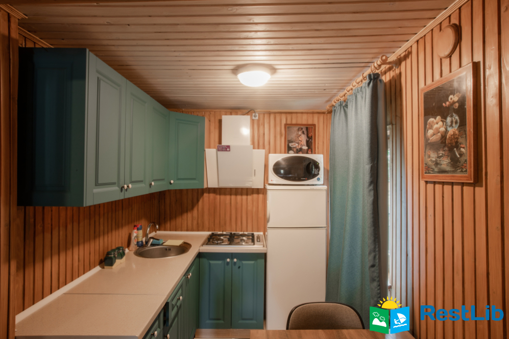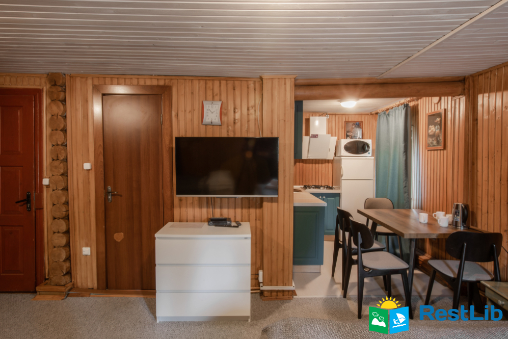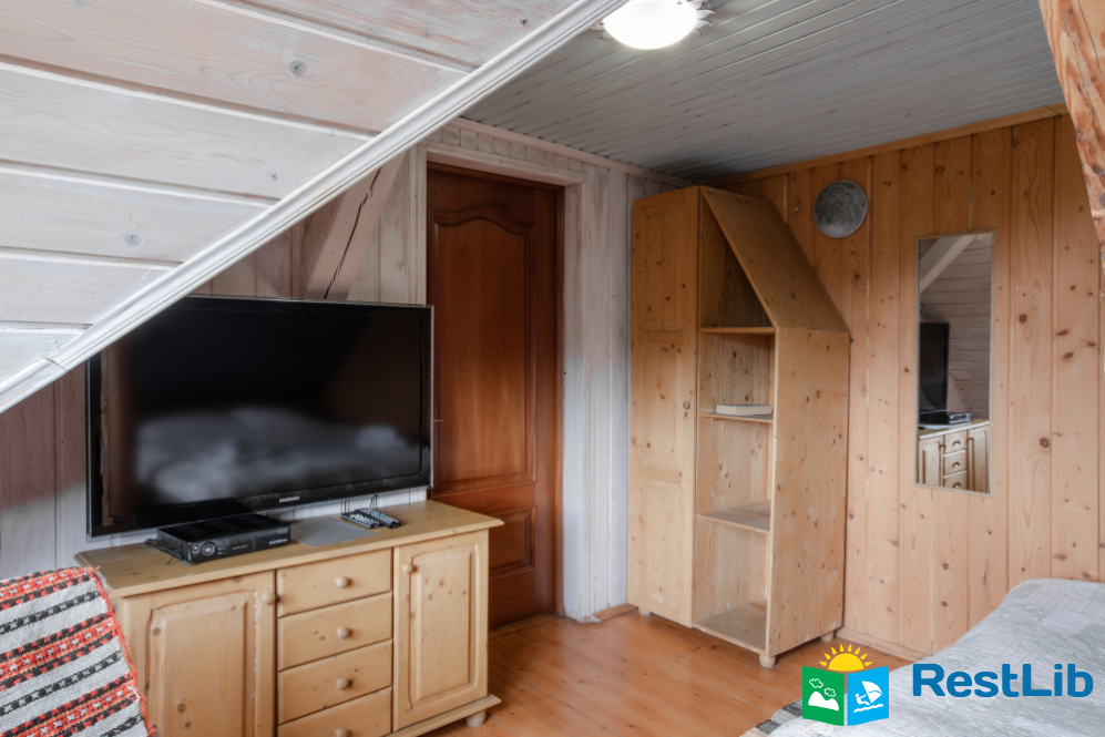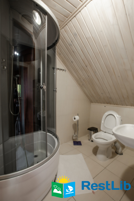 - На першому поверсі - чотирьохмісна кімната (двоспальне ліжко, 2 односпальна ліжка, вішалка для одягу, телевізор, кухонний куток - мікрохвильова піч, холодильник, електрочайник, посуд, мийка, обідній стіл; санвузол - душова кабіна, туалет, умивальник).