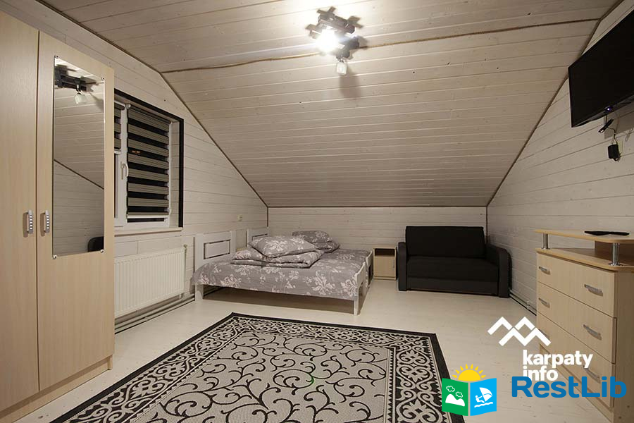 Двоспальне та односпальне або 3 односпальні ліжка, шафа для одягу, телевізор, санвузол.