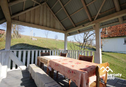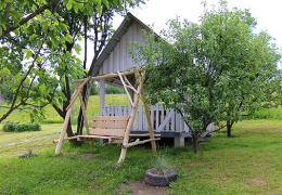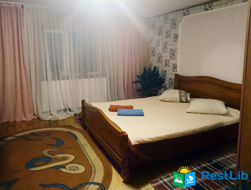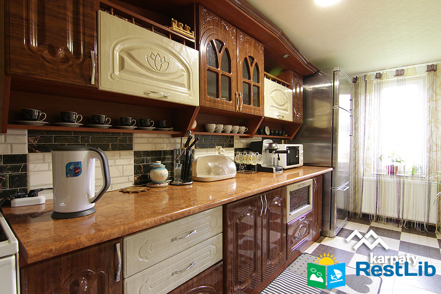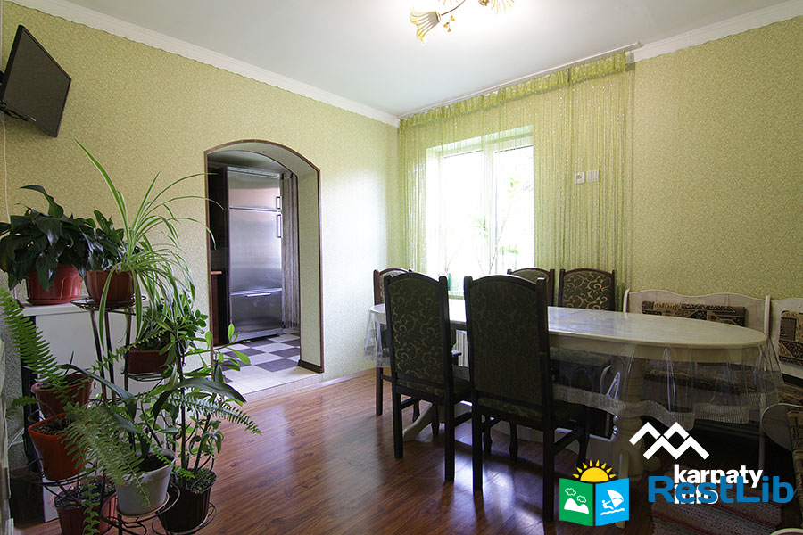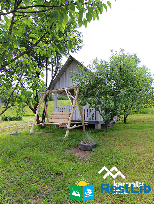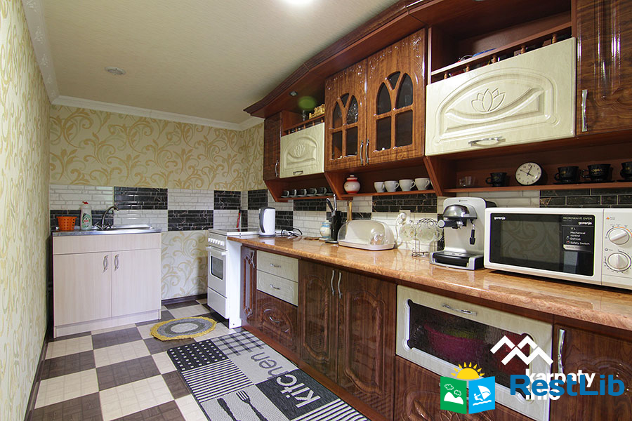 На першому поверсі — кухня (мікрохвильова піч, холодильник, електрочайник, посуд, обідній стіл); двомісний номер (двоспальне ліжко, шафа для одягу, телевізор).