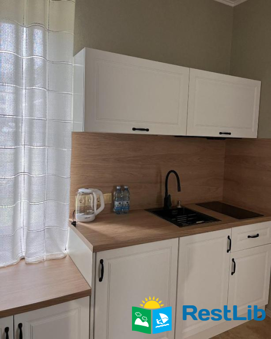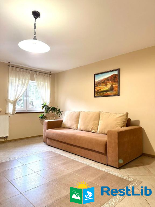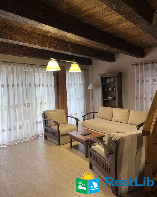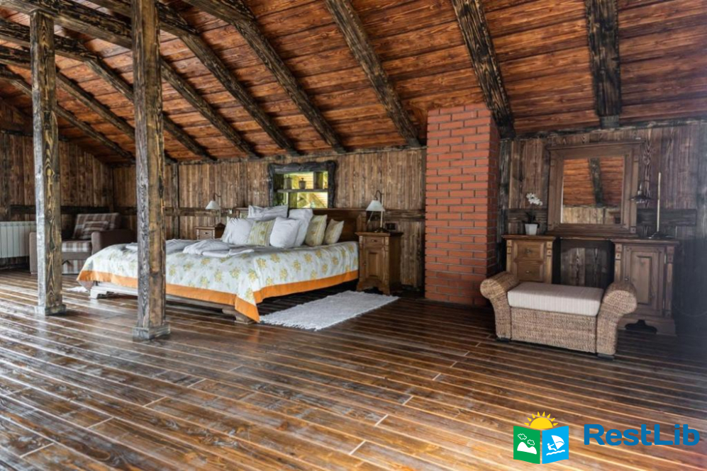 Основою дизайну інтер’єру є дерево, камінь та природні тканини, які несуть в собі комфорт домашньої атмосфери. А відкритий простір в котеджі дарує необхідне відчуття свободи та усамітнення з природою Кількість осіб: 2 дорослих