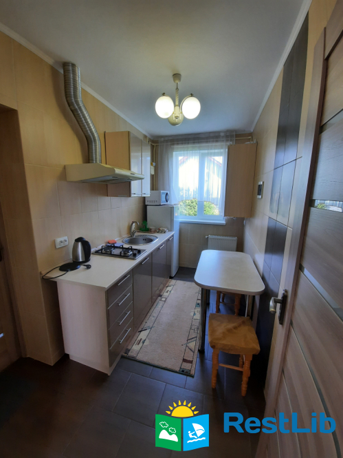 Двокімнатний дім для відпочинку сімейного типу (дво-тримісний): кухня (кухонна стінка, чайник, мікрохвильова піч, столовий посуд, холодильник),