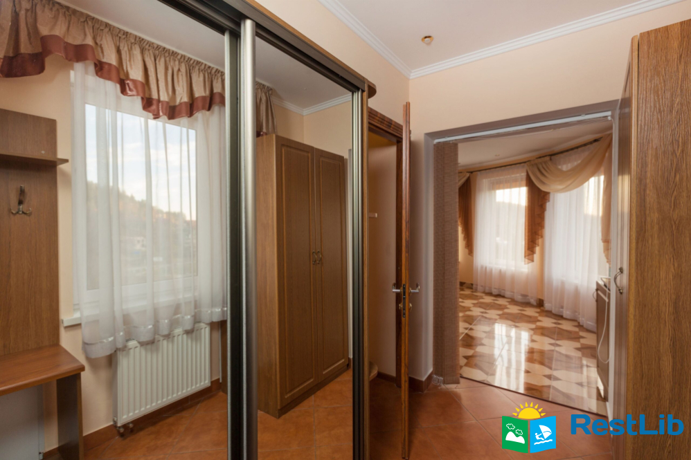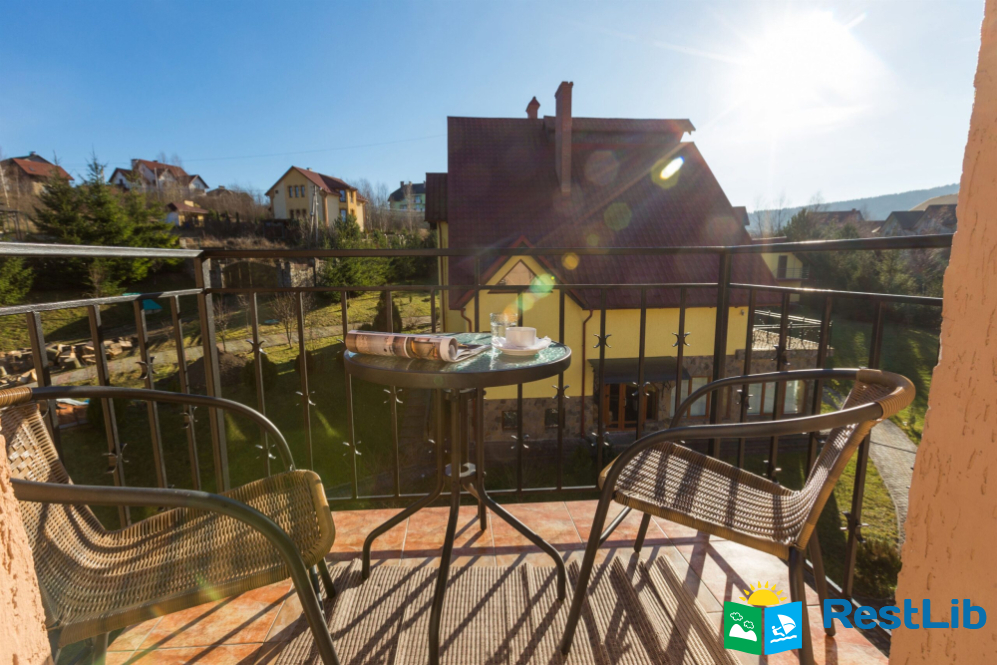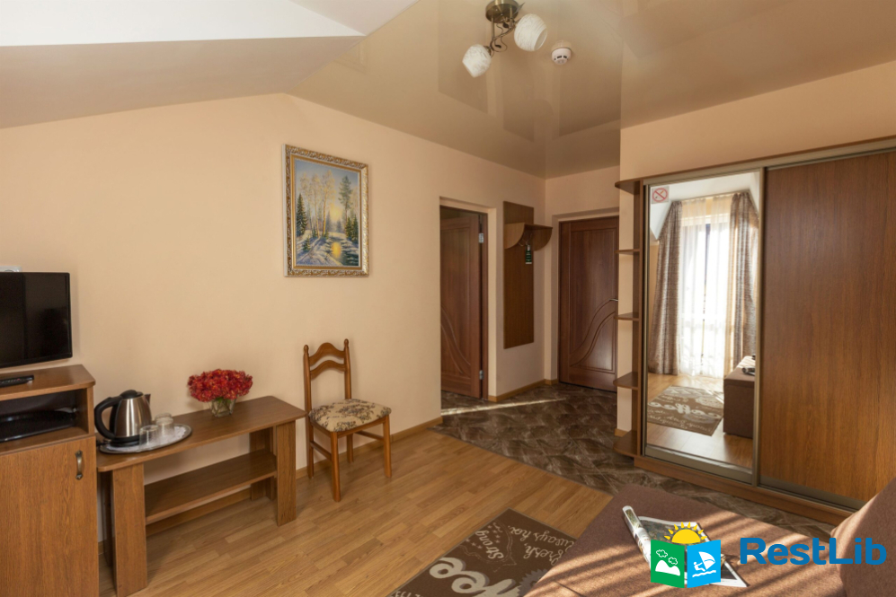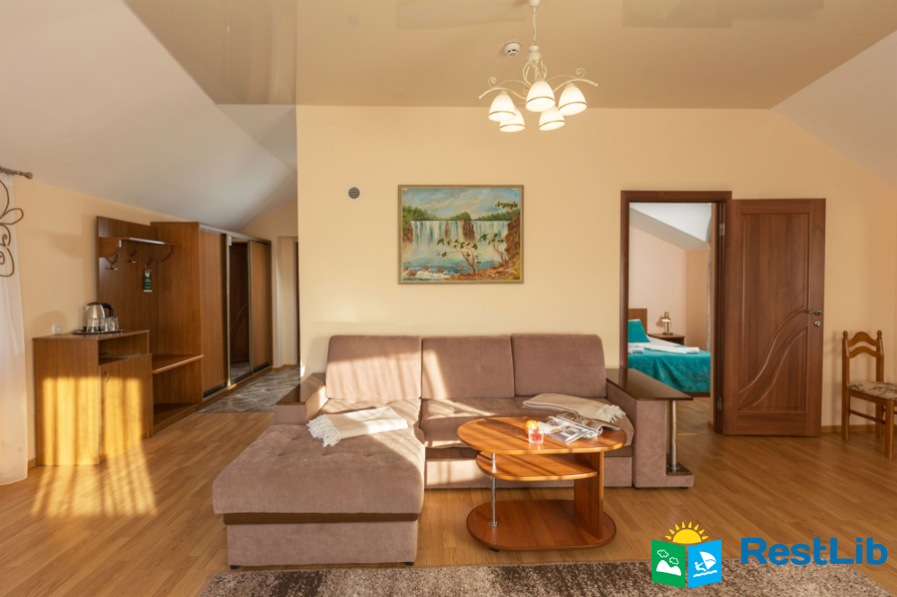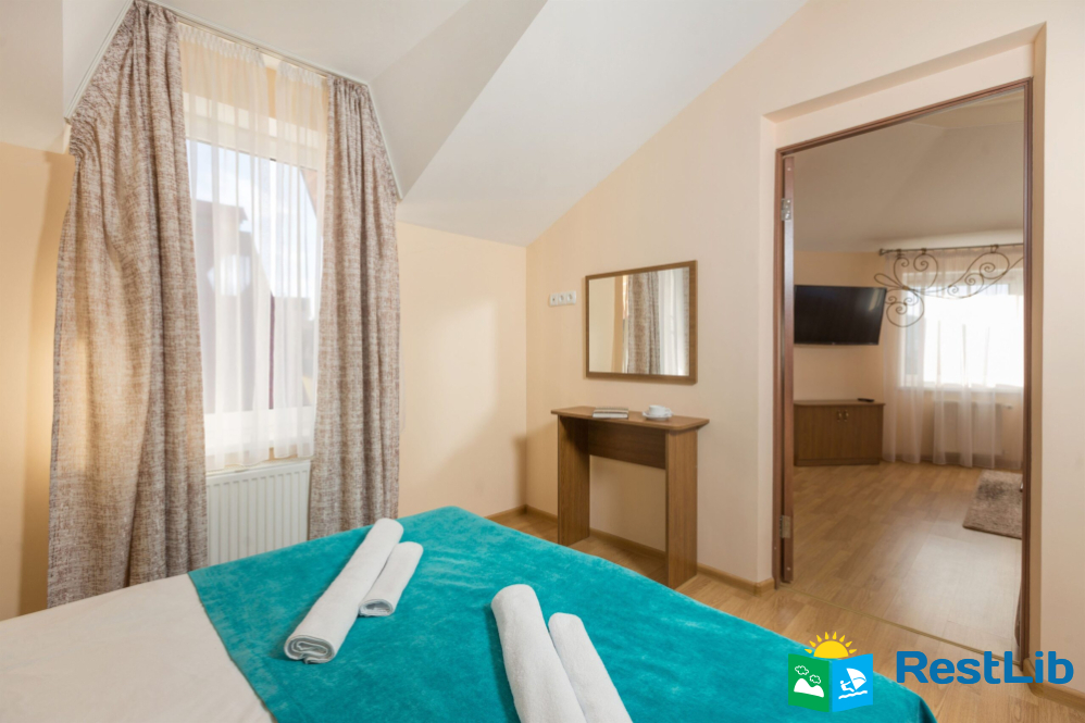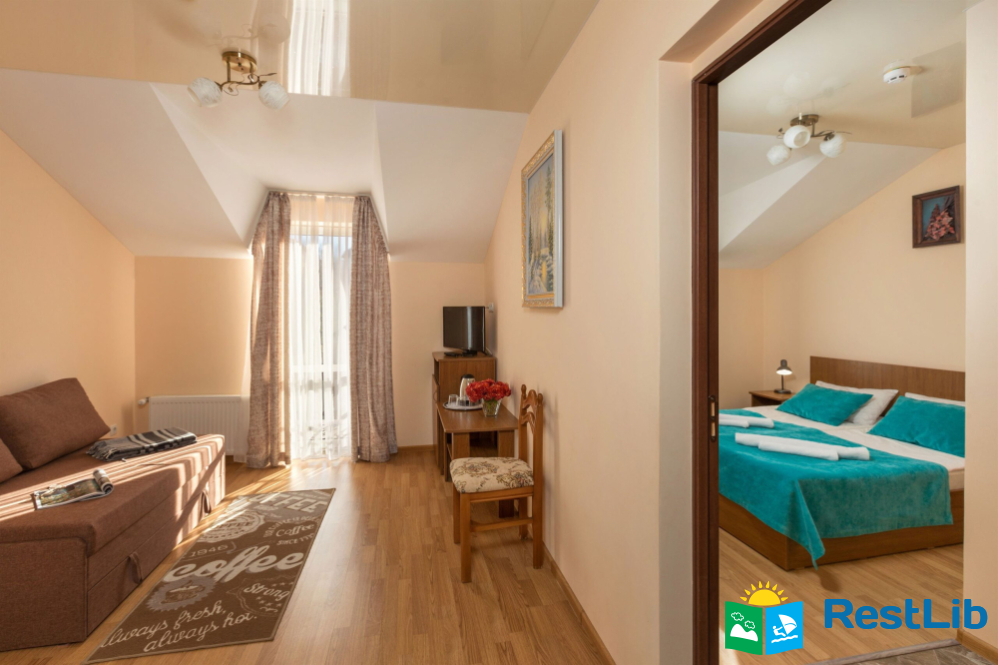 Номер Люкс затишний та просторий. Двокімнатний. Оснащений всім необхідним для комфортного перебування. В номері є балкон, з якого відкривається мальовничий вид на гори Прикарпаття.