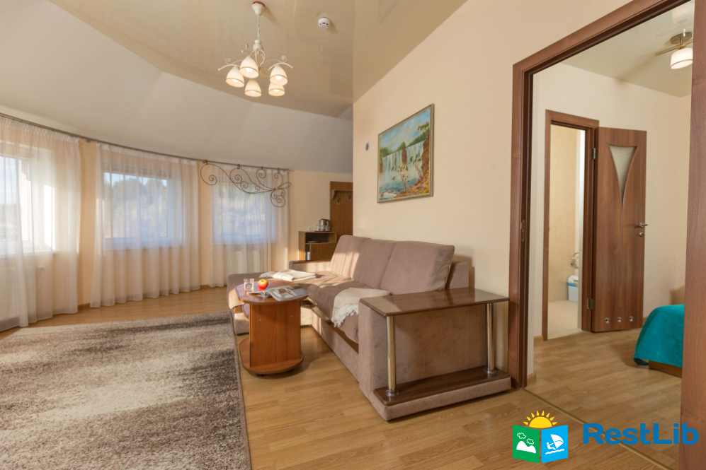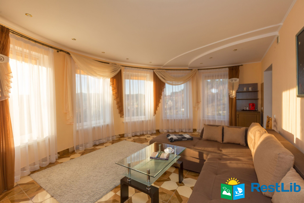 Номер Суперлюкс затишний та просторий. Двокімнатний. Оснащений всім необхідним для комфортного перебування. Вітальня номеру з панорамними вікнами на всю стіну, з яких відкривається мальовничий вид на гори Прикарпаття.