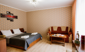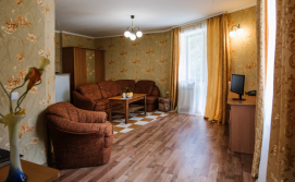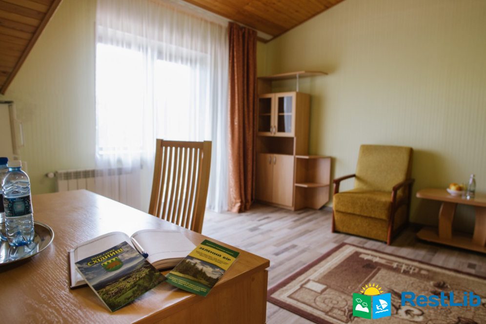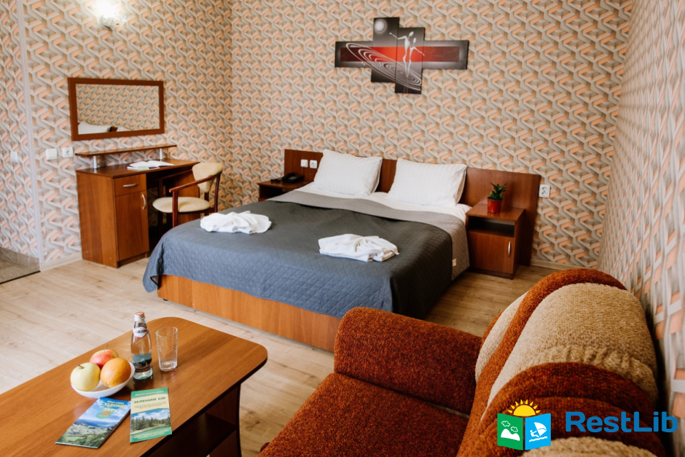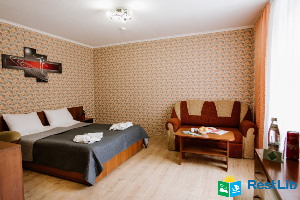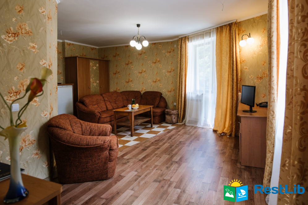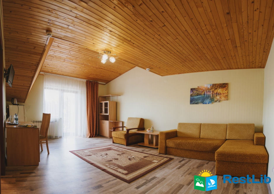 Люкс покращеного планування - двокімнатний номер з балконом: вітальня з меблевим гарнітуром, спальна кімната з двоспальним ліжком Окремий санвузол: унітаз, умивальник, ванна, фен, рушники. Автономне опалення, круглодобово гаряча і холодна вода. Супутникове телебачення, телевізор, холодильник, безкоштовний Інтернет, телефон.