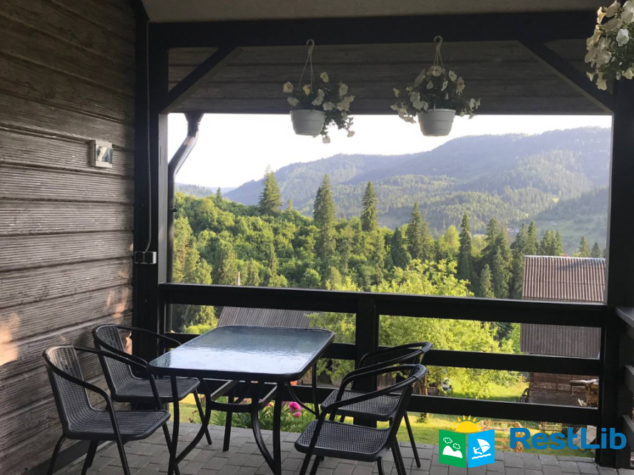 - Простора тераса з неймовірним видом на Карпатські гори — ідеальне місце для ранкової кави чи вечірнього відпочинку на свіжому повітрі