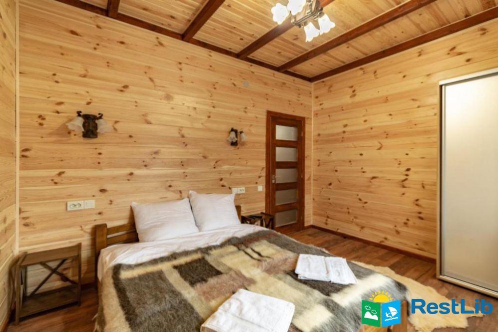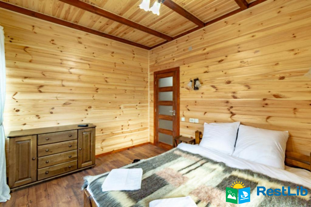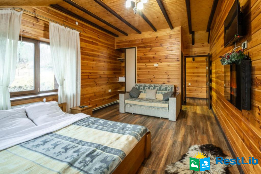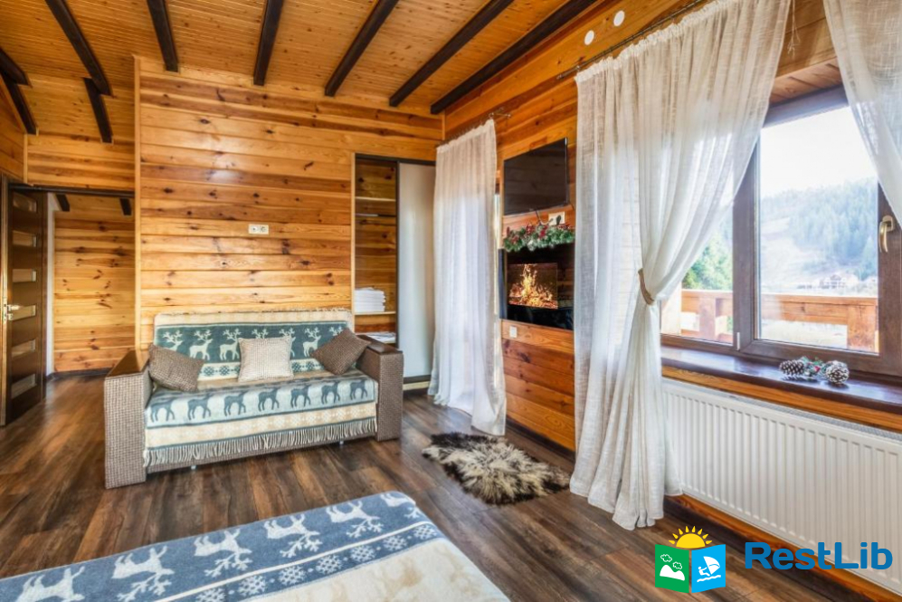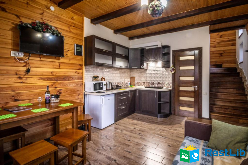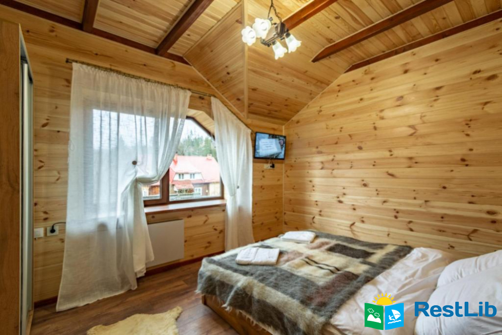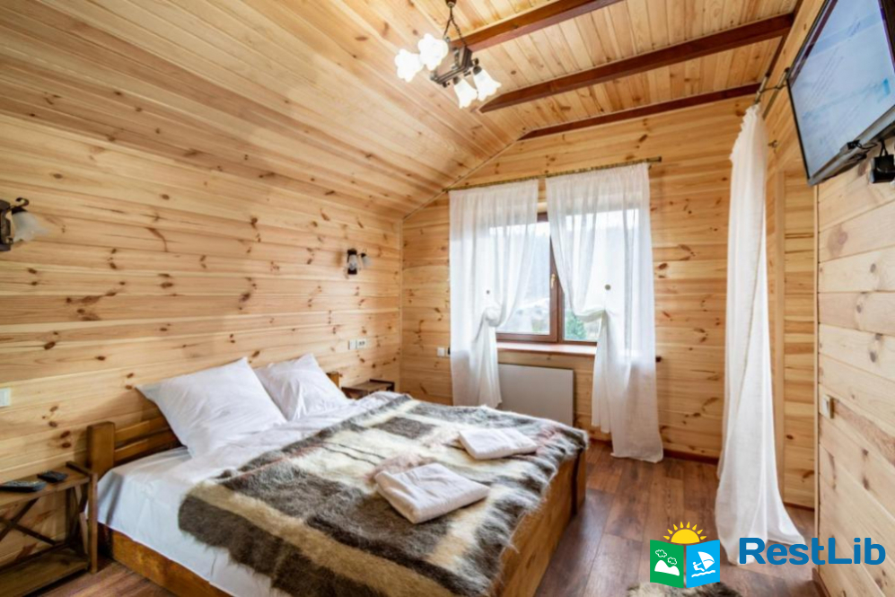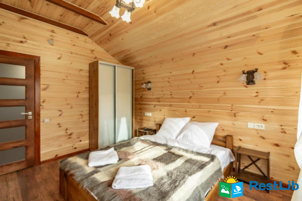 На другому поверсі розміщена чотиримісна спальня (ліжко на 2-х осіб та диван на 2-х осіб). А також санвузол! Кожен із котеджів має вихід на власний балкон! До Ваших послуг чудовий дерев’яний інтер’єр, виконаний у стилі шале.