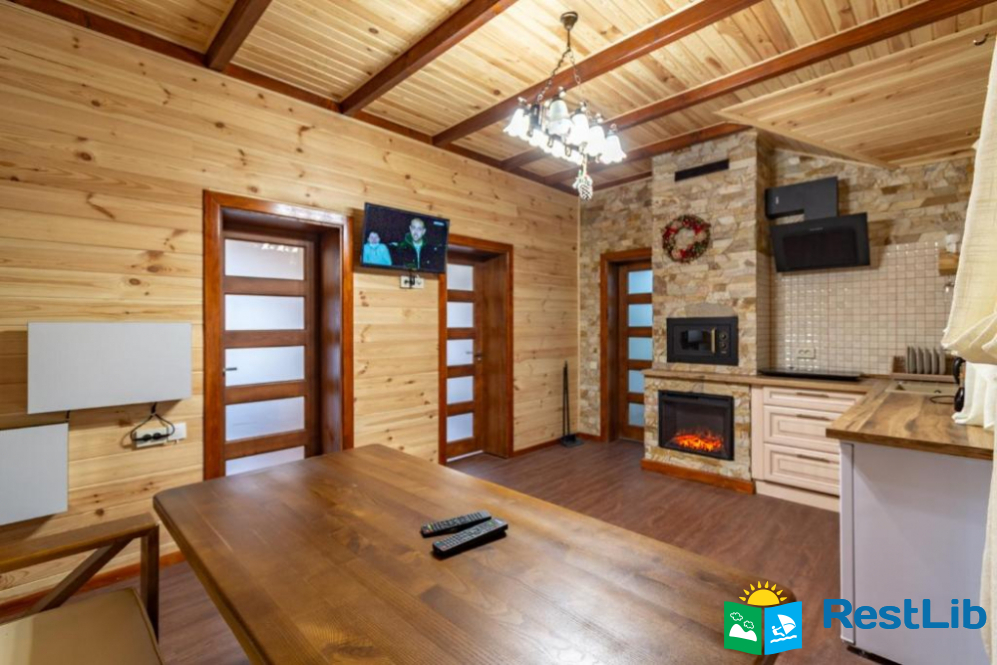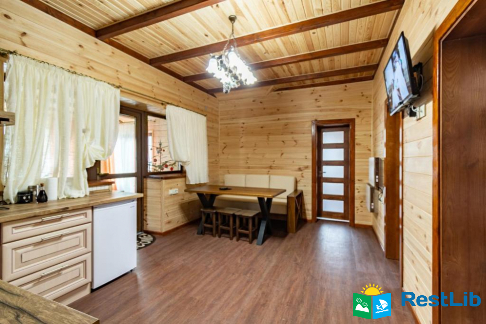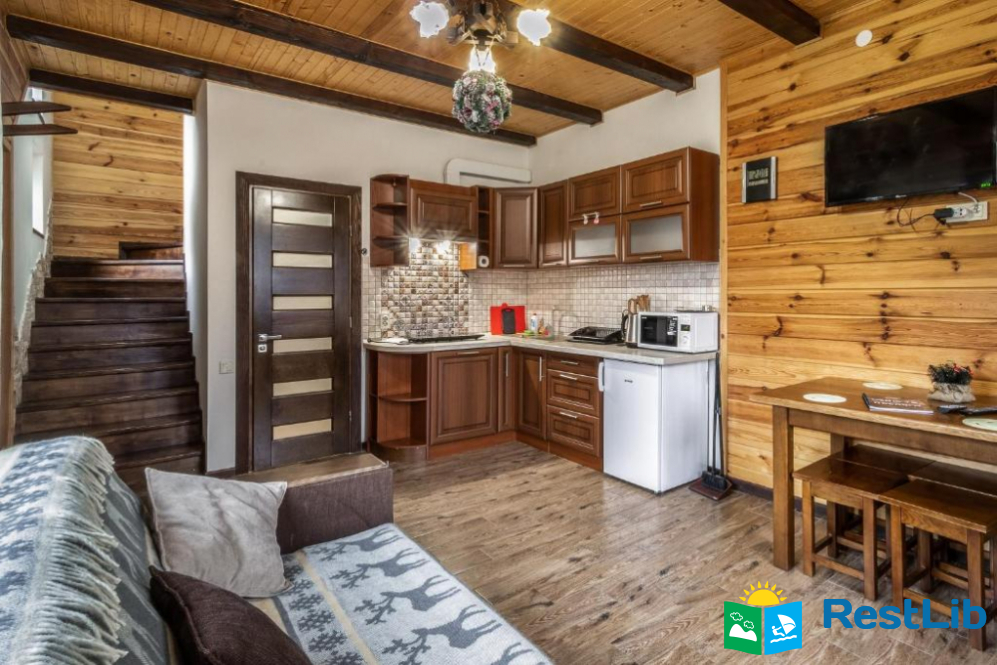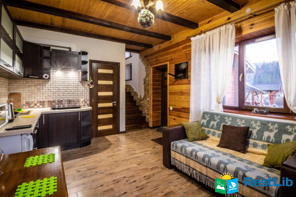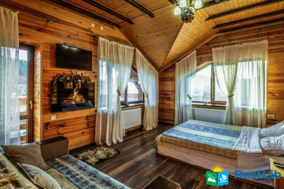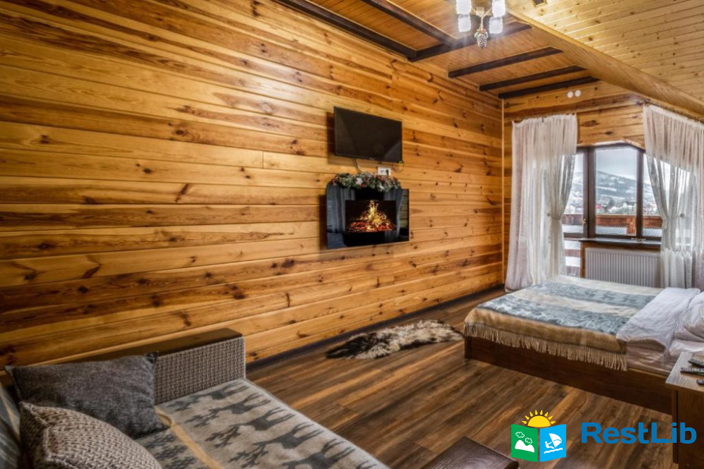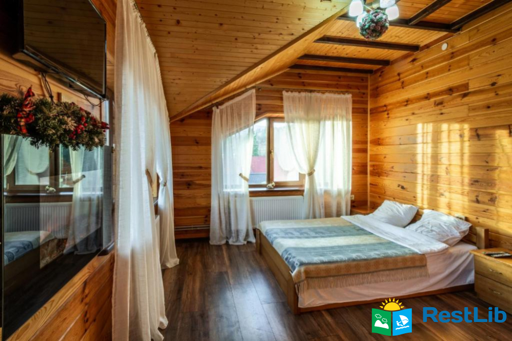 На другому поверсі розміщена чотиримісна спальня (ліжко на 2-х осіб та диван на 2-х осіб). А також санвузол! Кожен із котеджів має вихід на власний балкон! До Ваших послуг чудовий дерев’яний інтер’єр, виконаний у стилі шале.