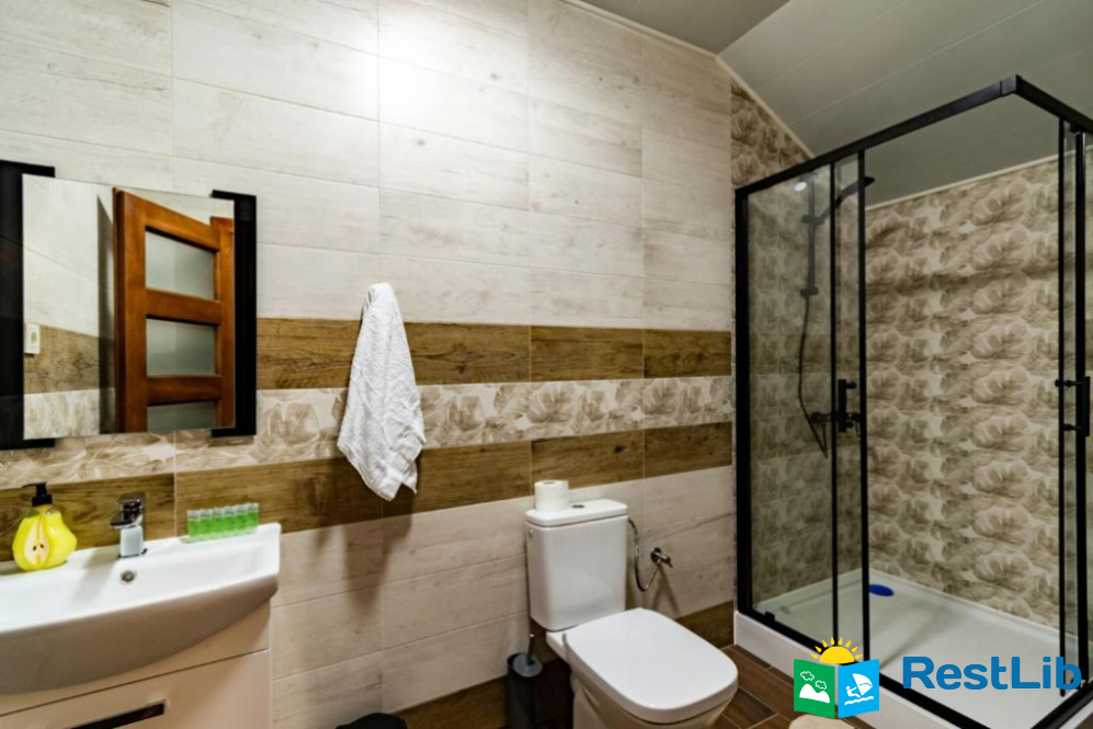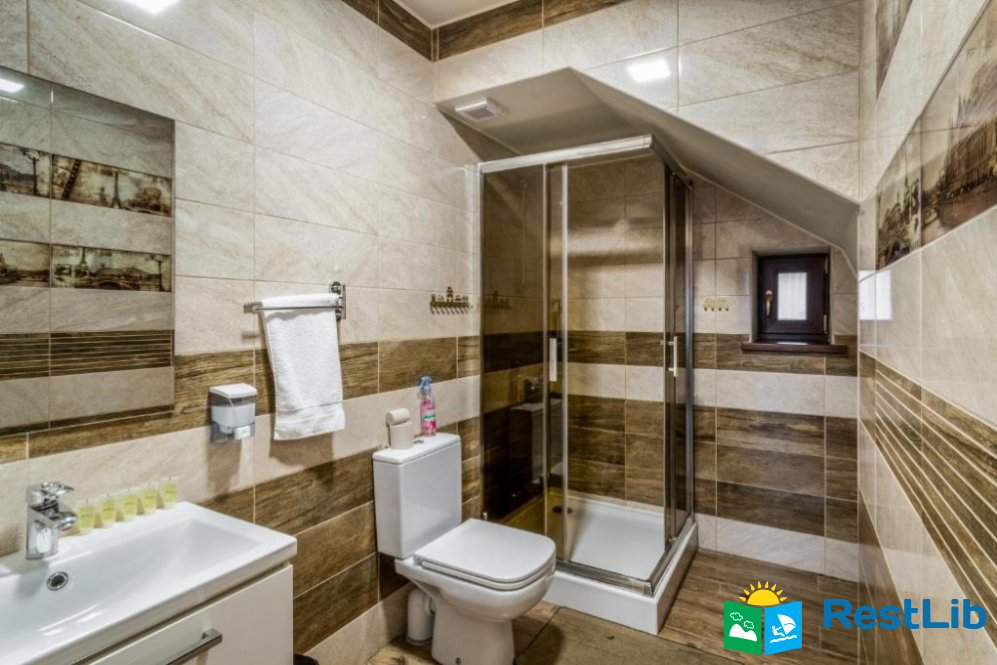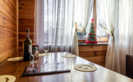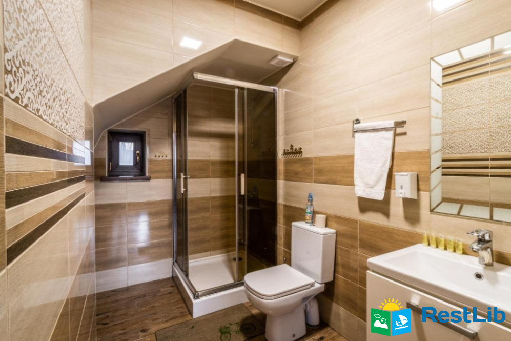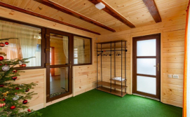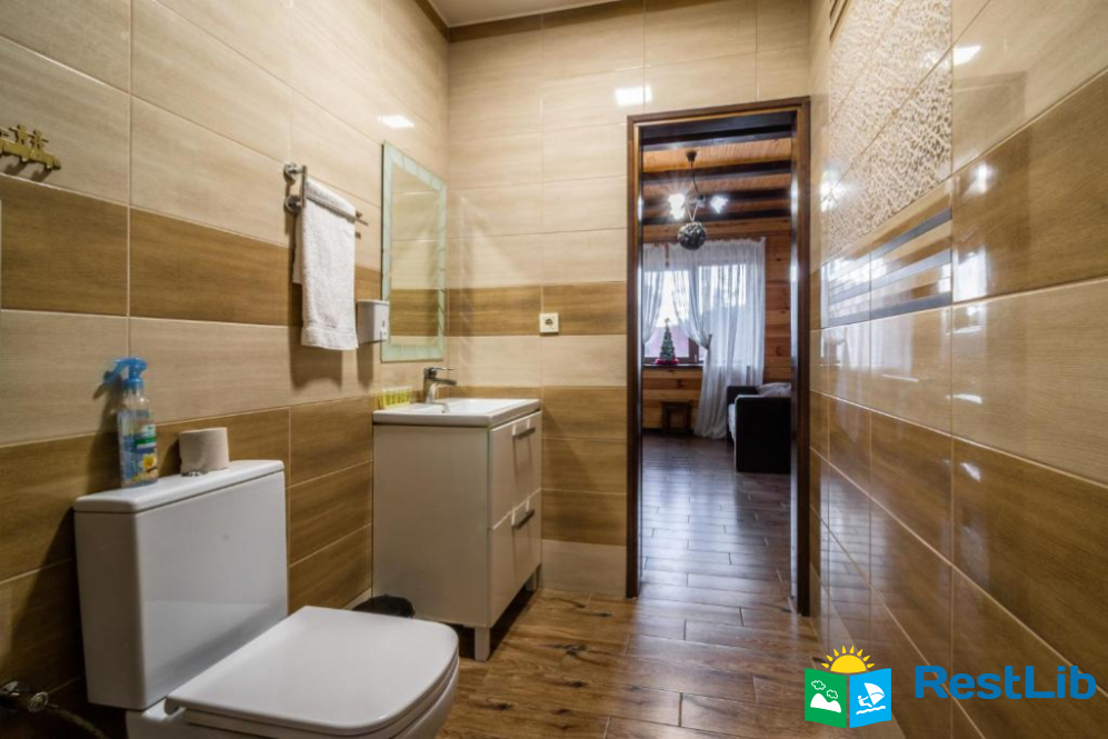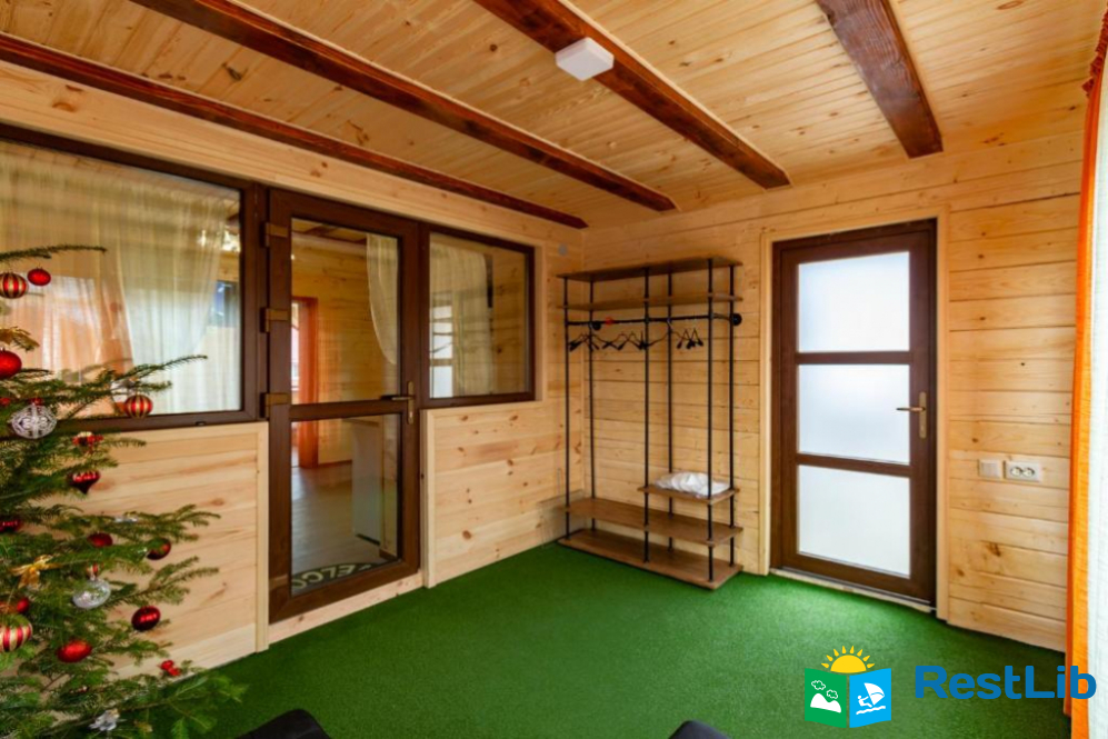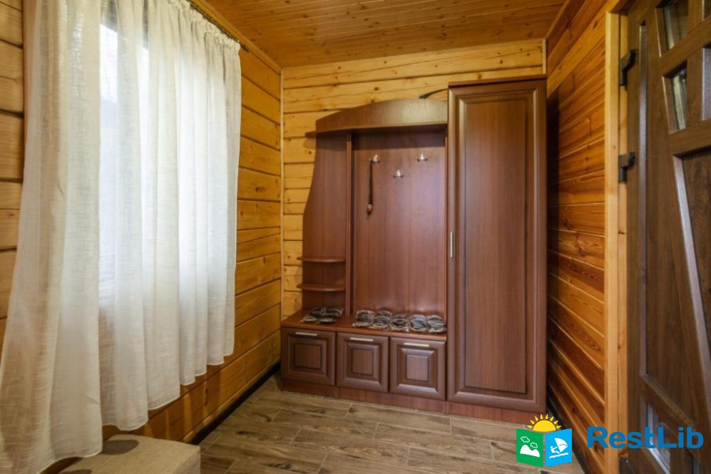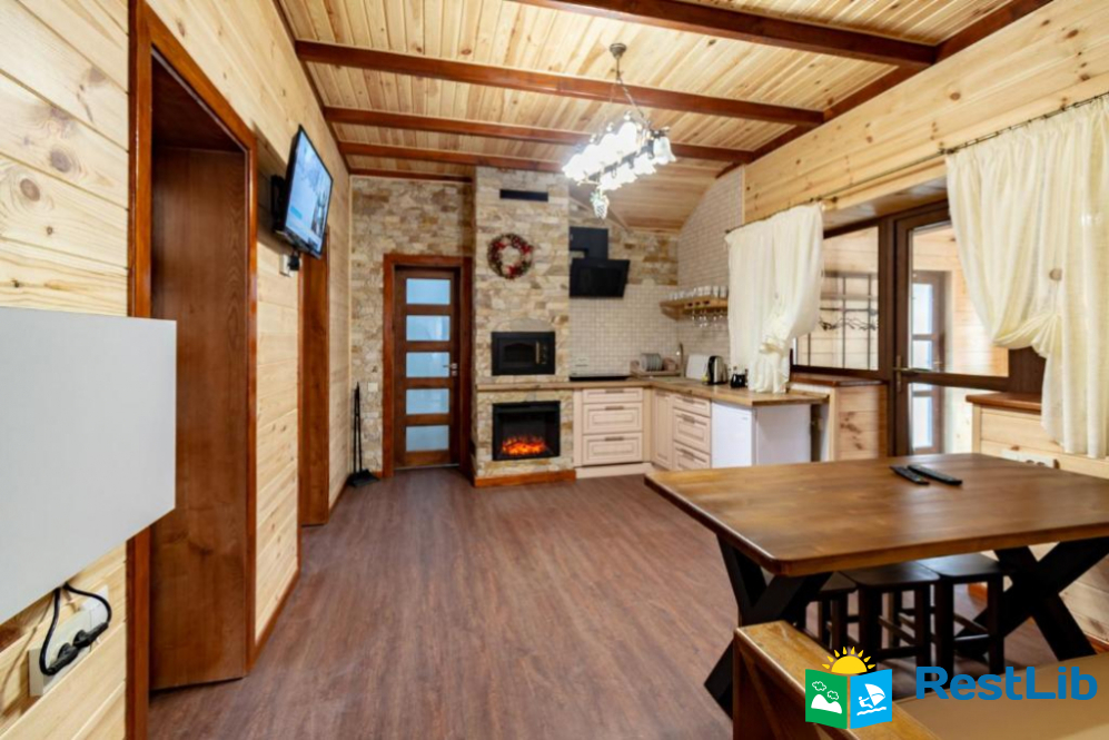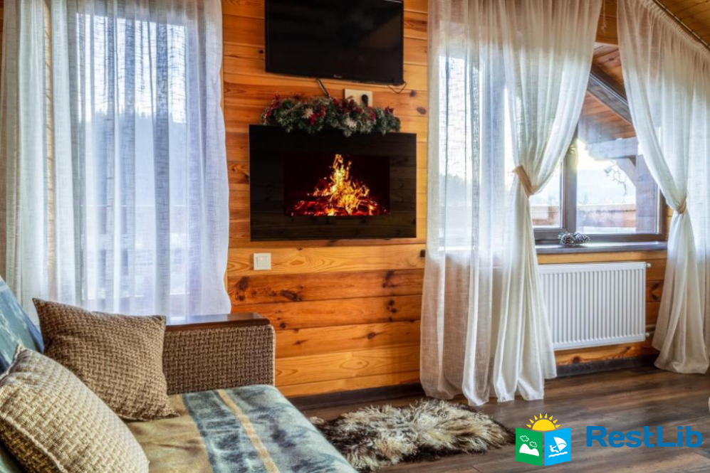 На другому поверсі розміщена чотиримісна спальня (ліжко на 2-х осіб та диван на 2-х осіб). А також санвузол! Кожен із котеджів має вихід на власний балкон! До Ваших послуг чудовий дерев’яний інтер’єр, виконаний у стилі шале.