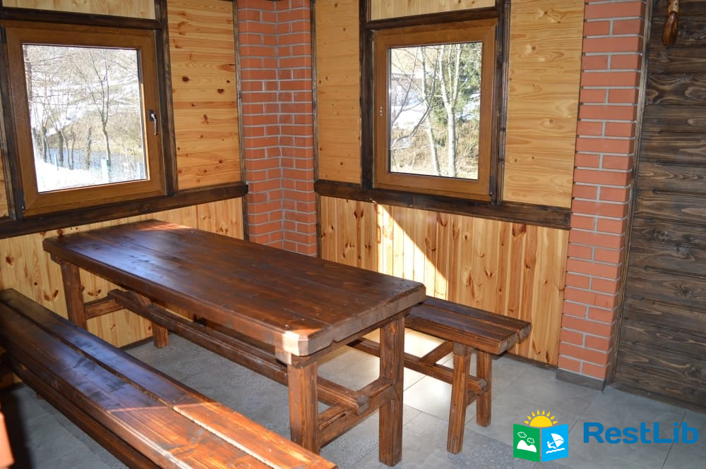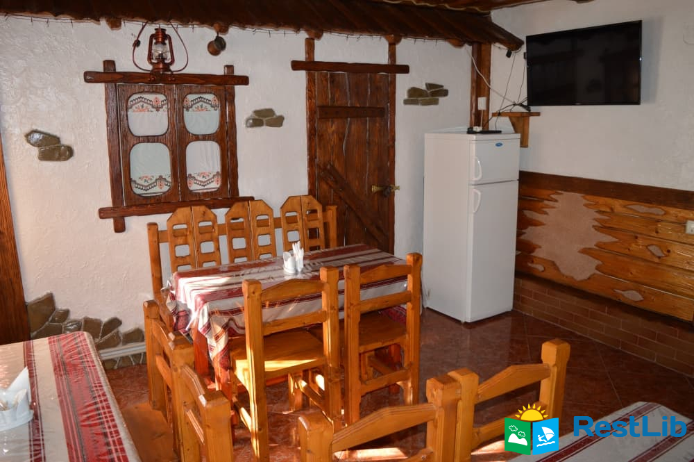 Перший поверх: кухня (кухонний гарнітур, техніка, посуд), столова, санвузол (душ, туалет, умивальник), один тримісний номер.