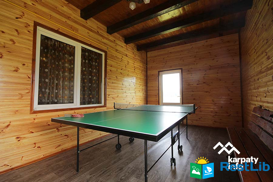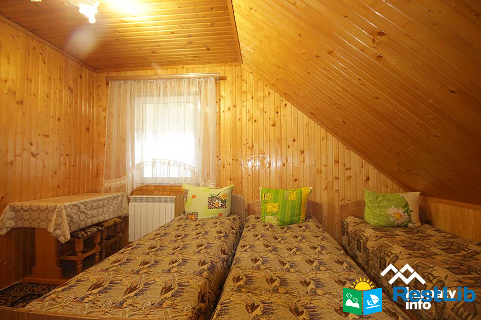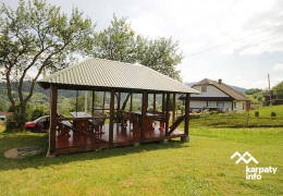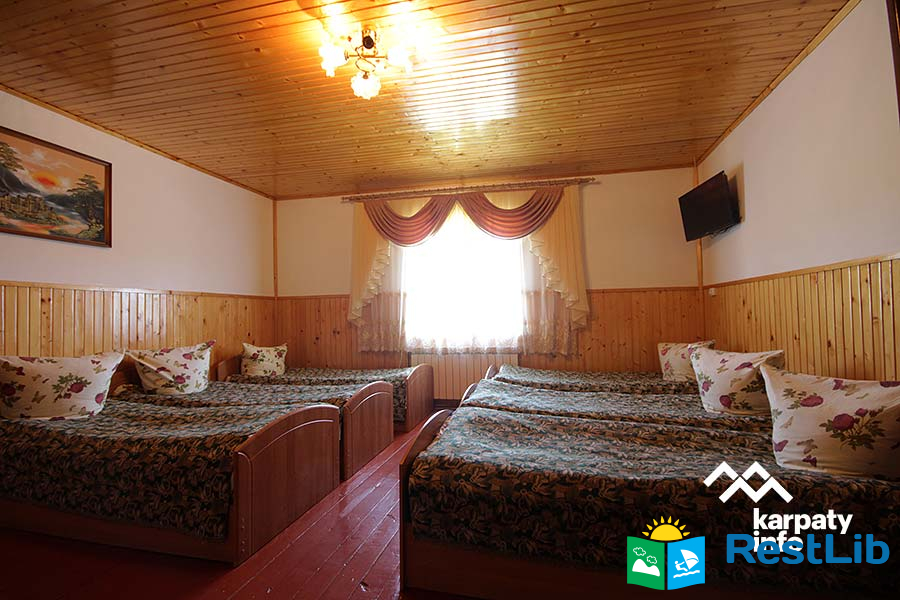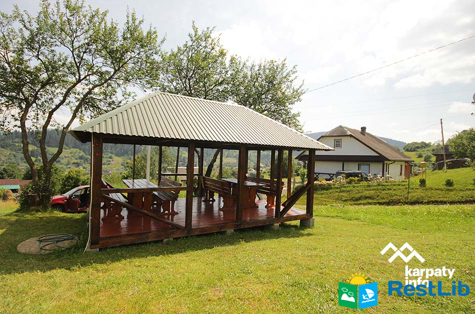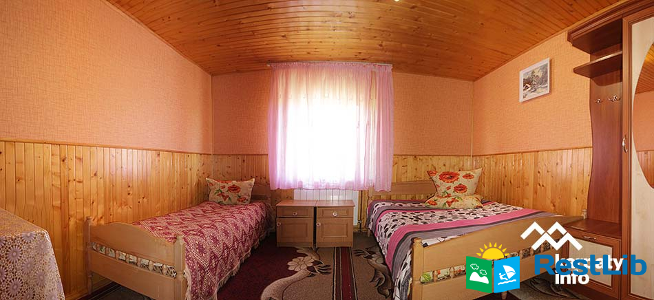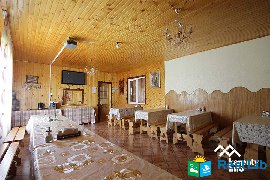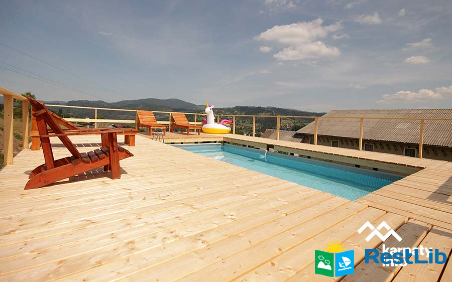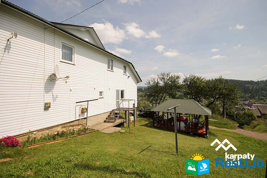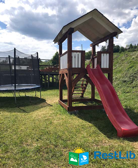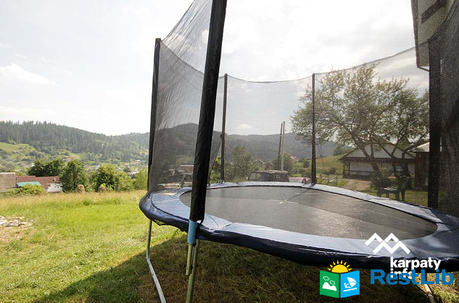На подвір'ї є двоповерховий будинок (15 номерів), альтанка, мангал, батут, відкритий літній басейн.