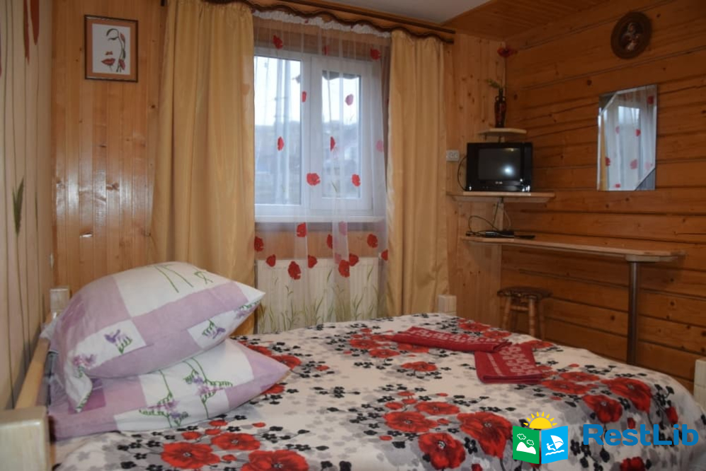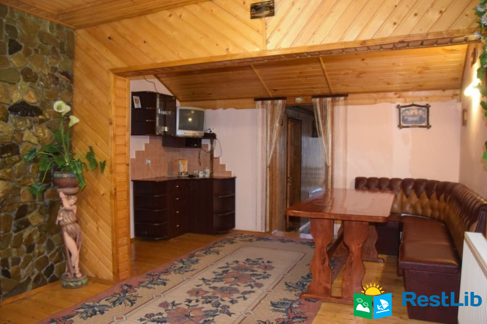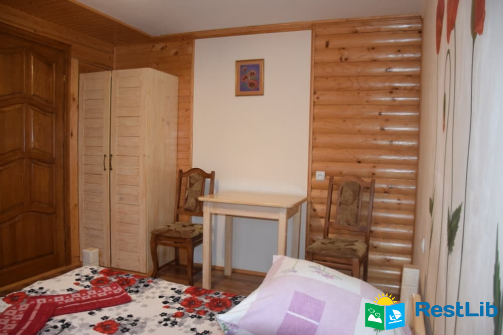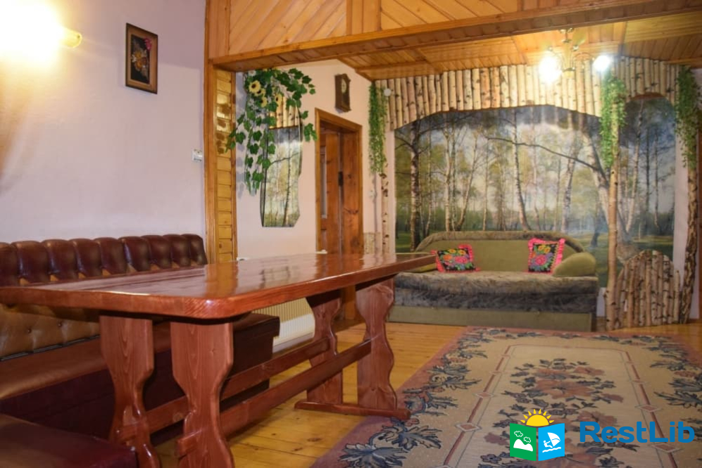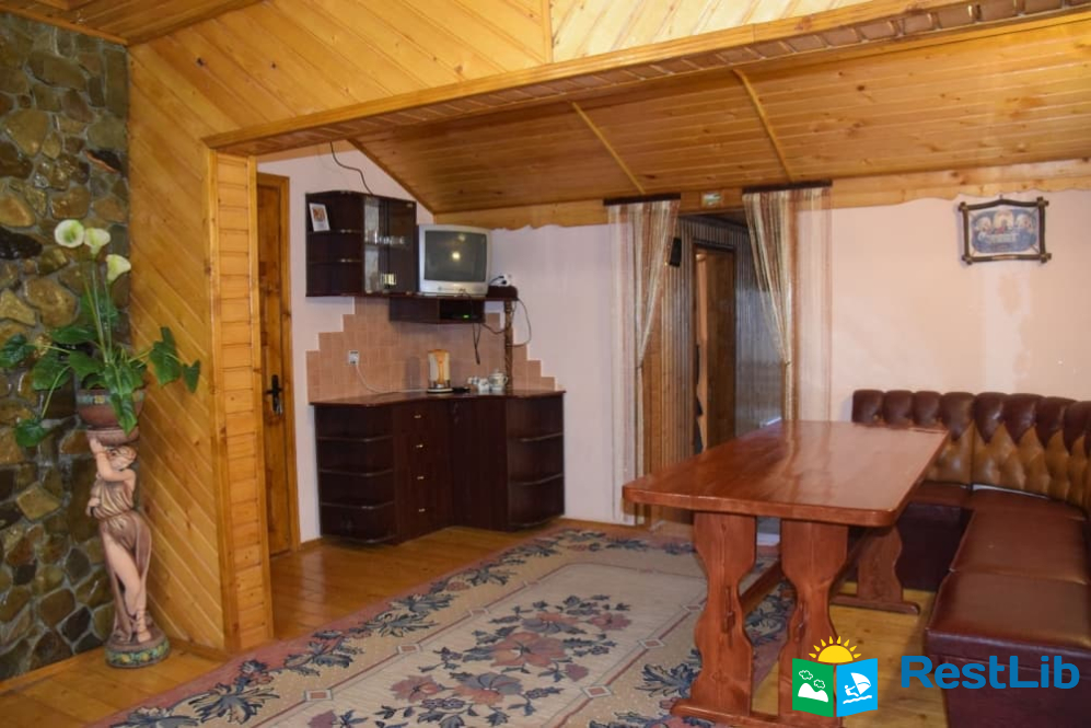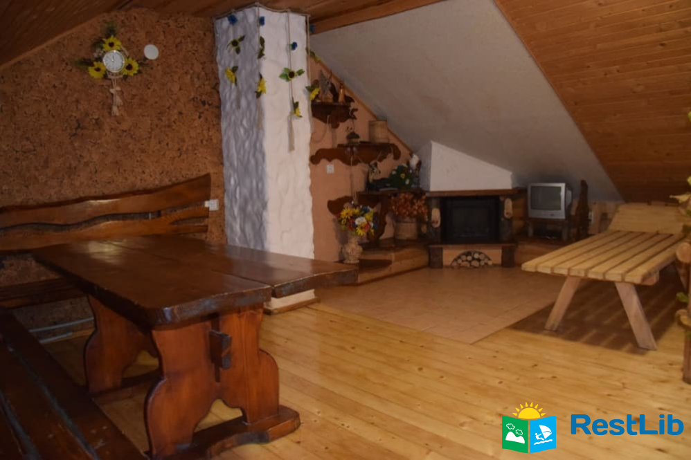 На другому поверсі :  чотири двомісних номери, в кожному двоспальне або 2 односпальні ліжка, телевізор, шафа, обідній стіл. Два санвузли на 4 кімнати (одни роздільний, окремо душ, окремо туалет), кухня (кухонний гарнітур, техніка, посуд), кімната для відпочинку (2 дивани, стіл).