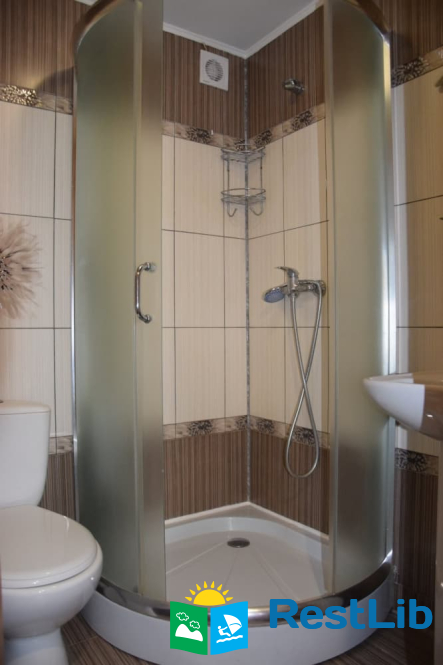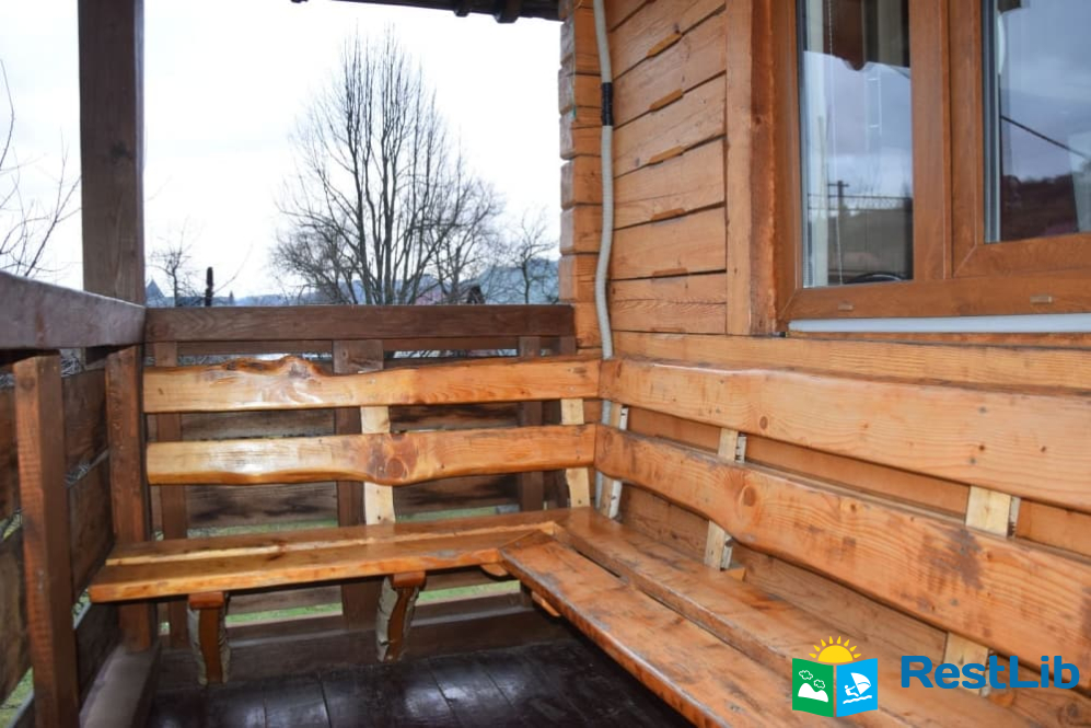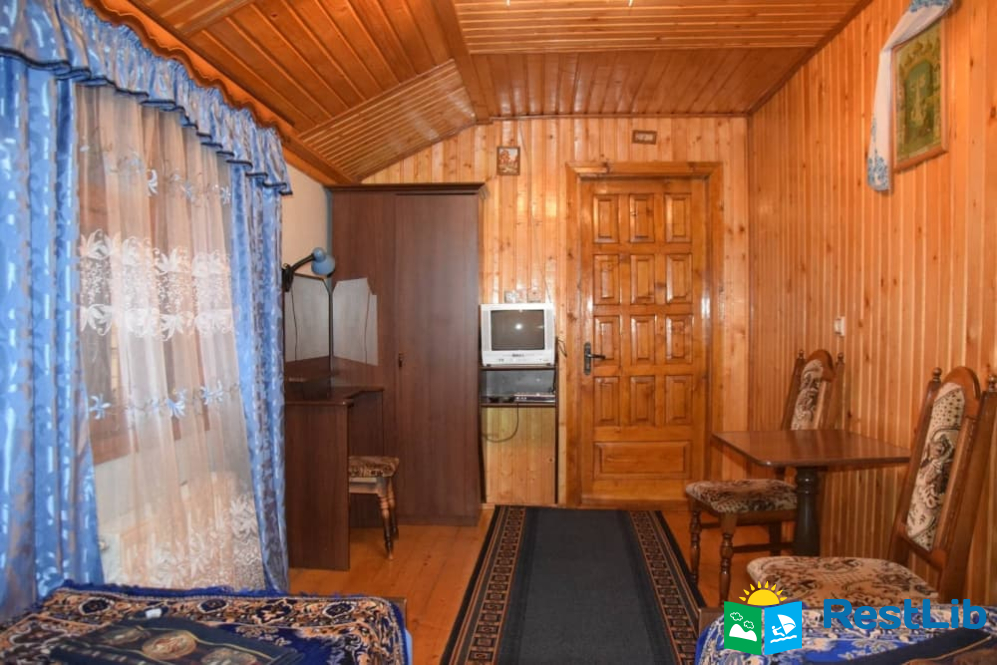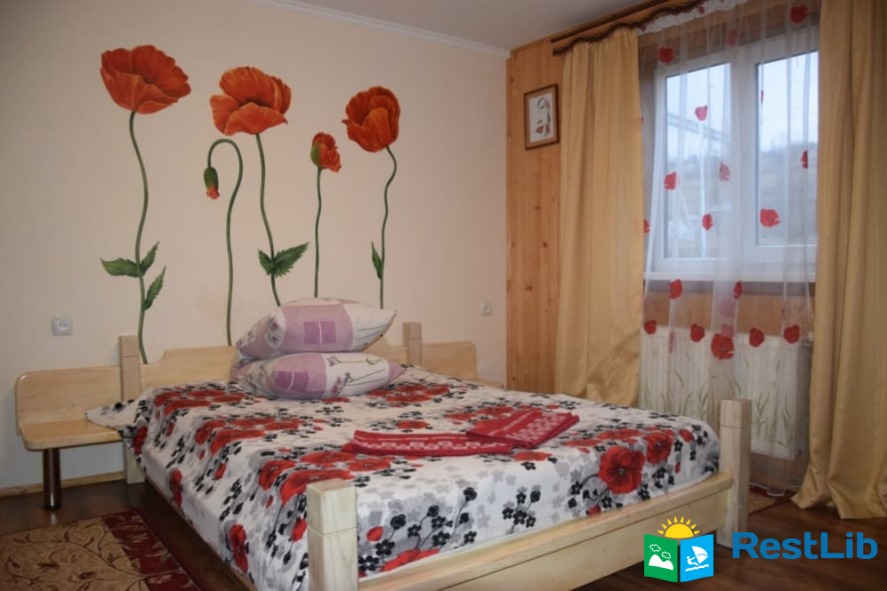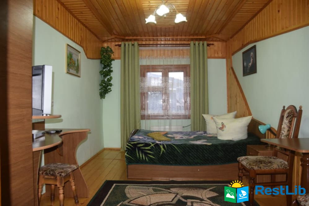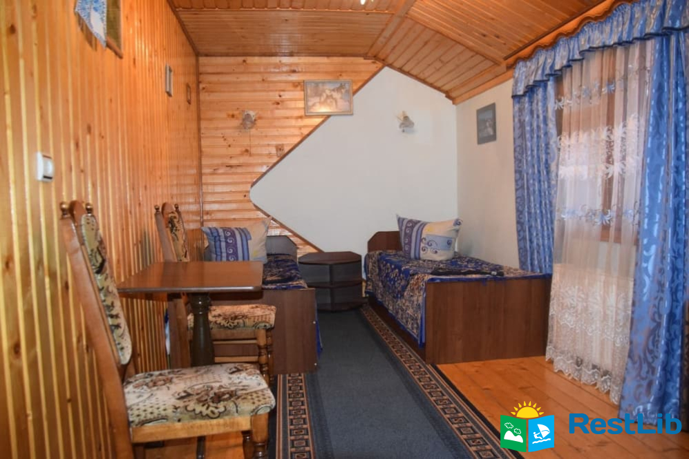 На другому поверсі :  чотири двомісних номери, в кожному двоспальне або 2 односпальні ліжка, телевізор, шафа, обідній стіл. Два санвузли на 4 кімнати (одни роздільний, окремо душ, окремо туалет), кухня (кухонний гарнітур, техніка, посуд), кімната для відпочинку (2 дивани, стіл).