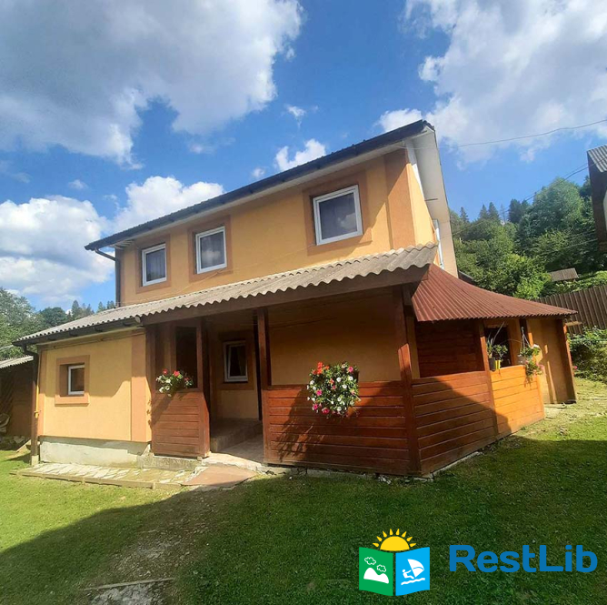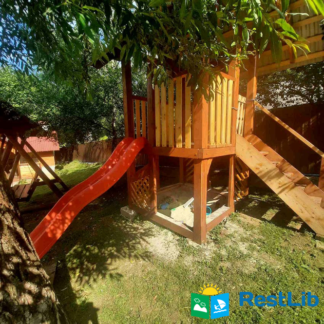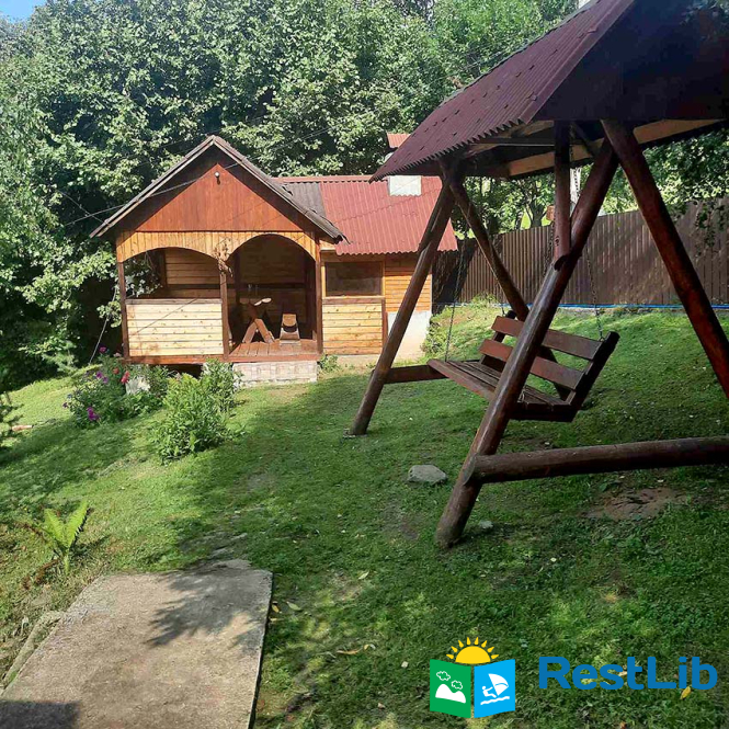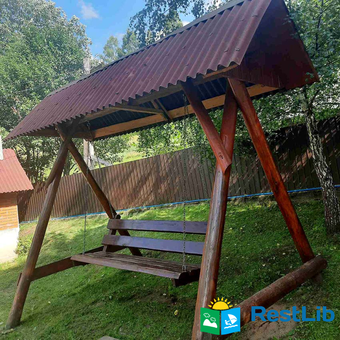 На території є двоповерховий будинок зі сауною на першому поверсі на 4 особи та окремий котедж на 7 осіб, альтанка, мангал, гойдалка, дитячий майданчик та літній басейн.
