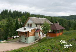 У котеджі: кухня-вітальня, 5 двомісних номерів, ванні кімнати.