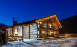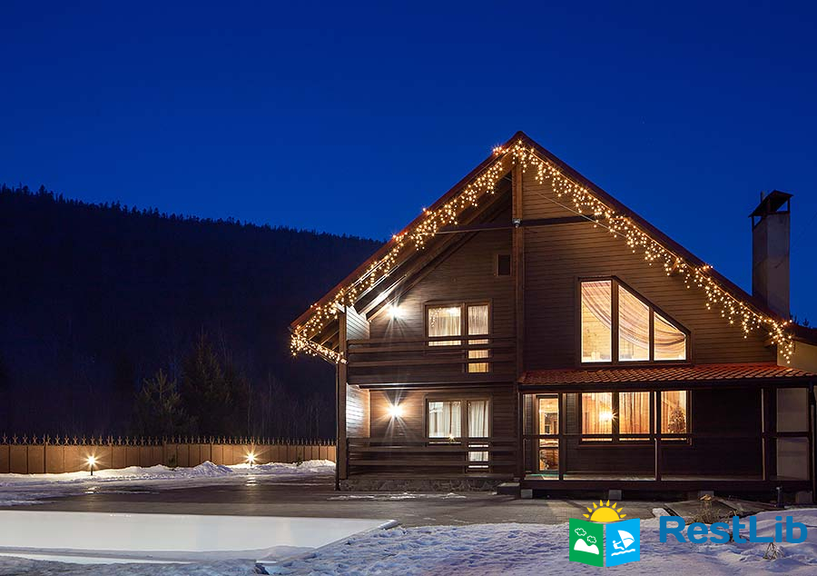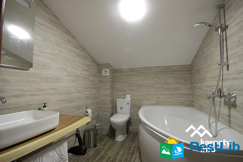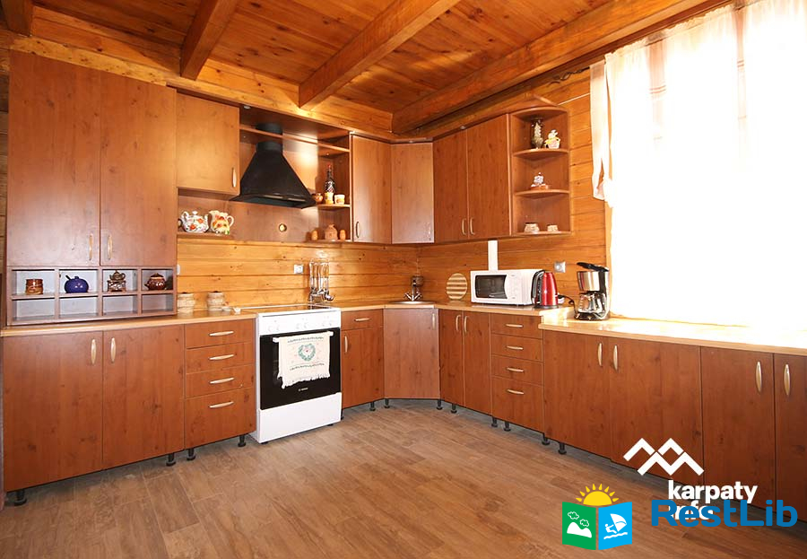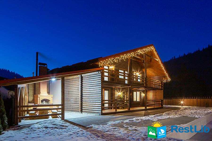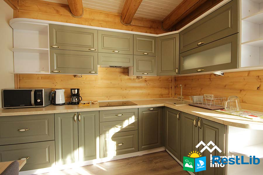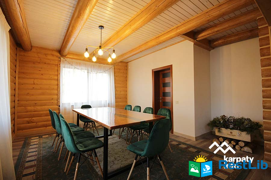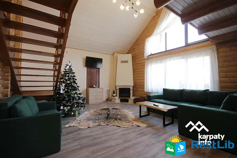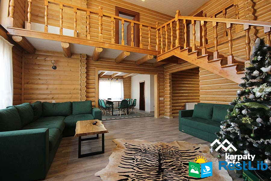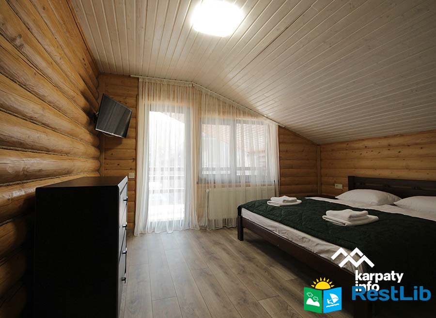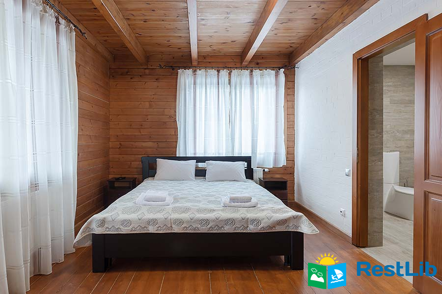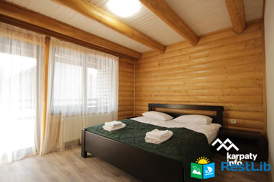 В першому котеджі (11 осіб) до послуг гостей вітальня з каміном, кухня, 5 двомісних номерів, 6 ванних кімнат.