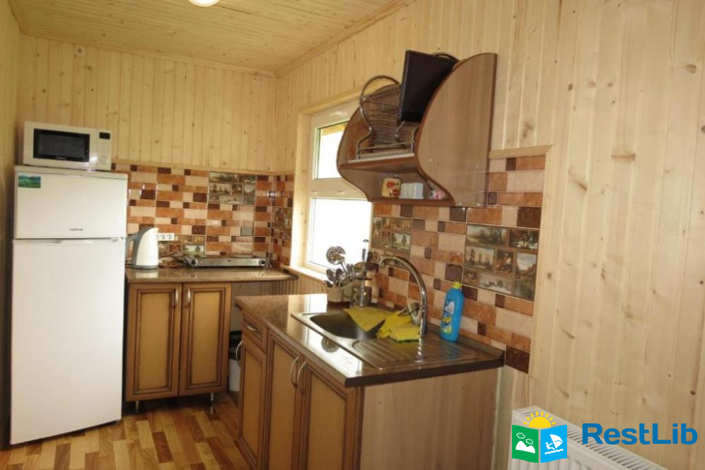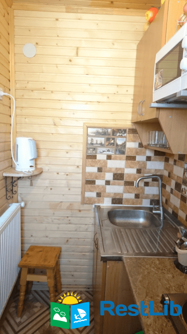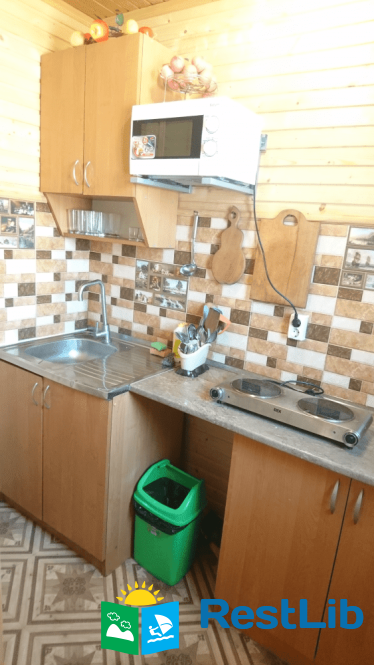 На першому поверсі — кухня (електрична плита, мікрохвильова піч, холодильник, електричний чайник, посуд, мийка);