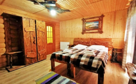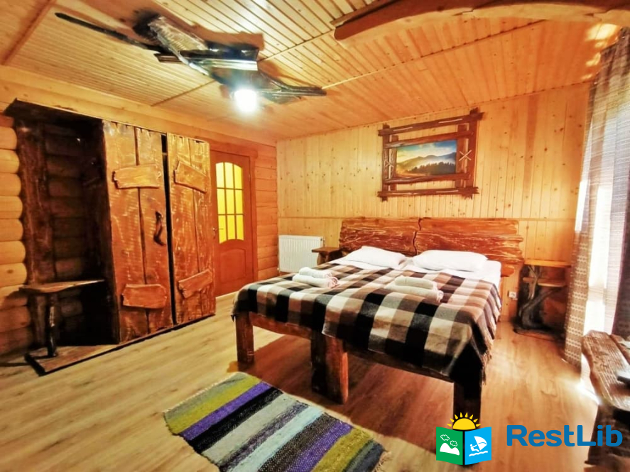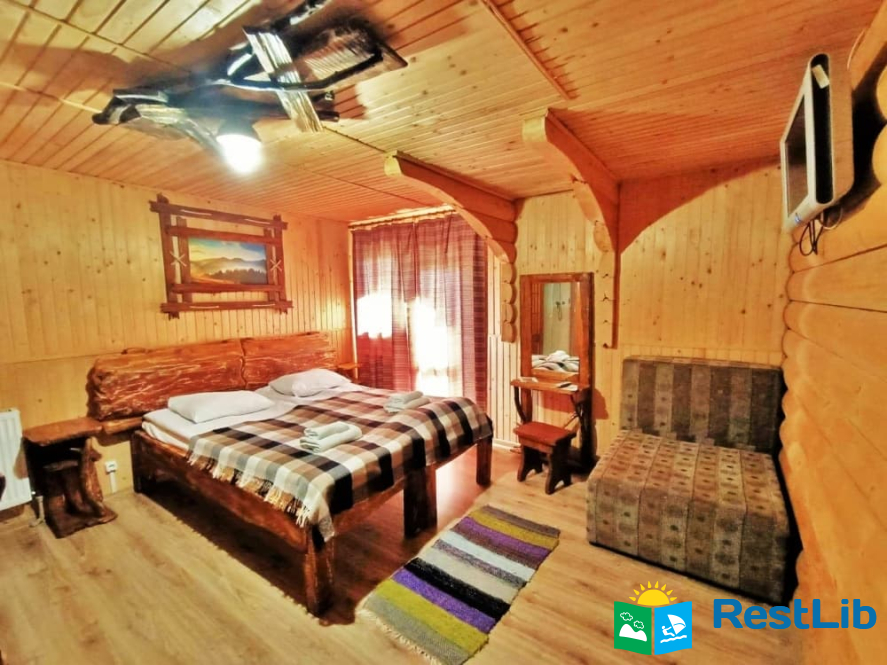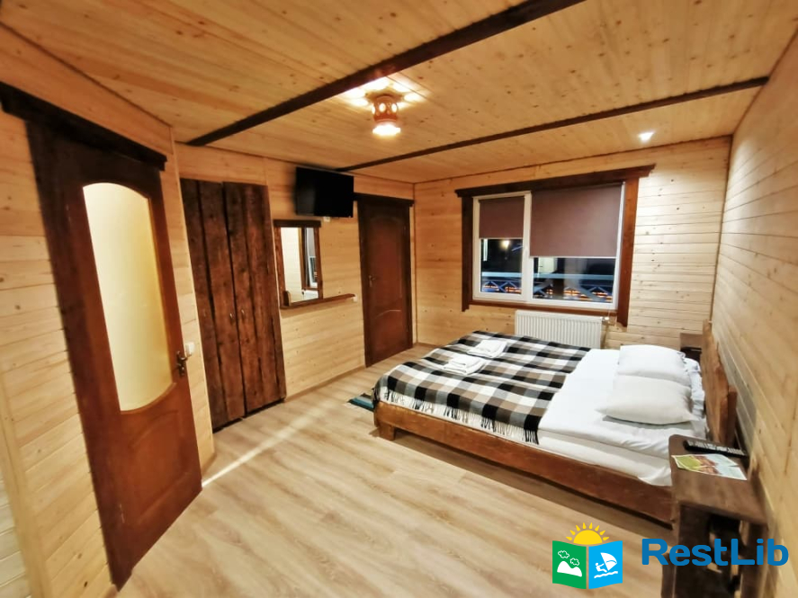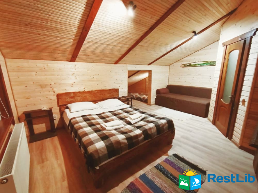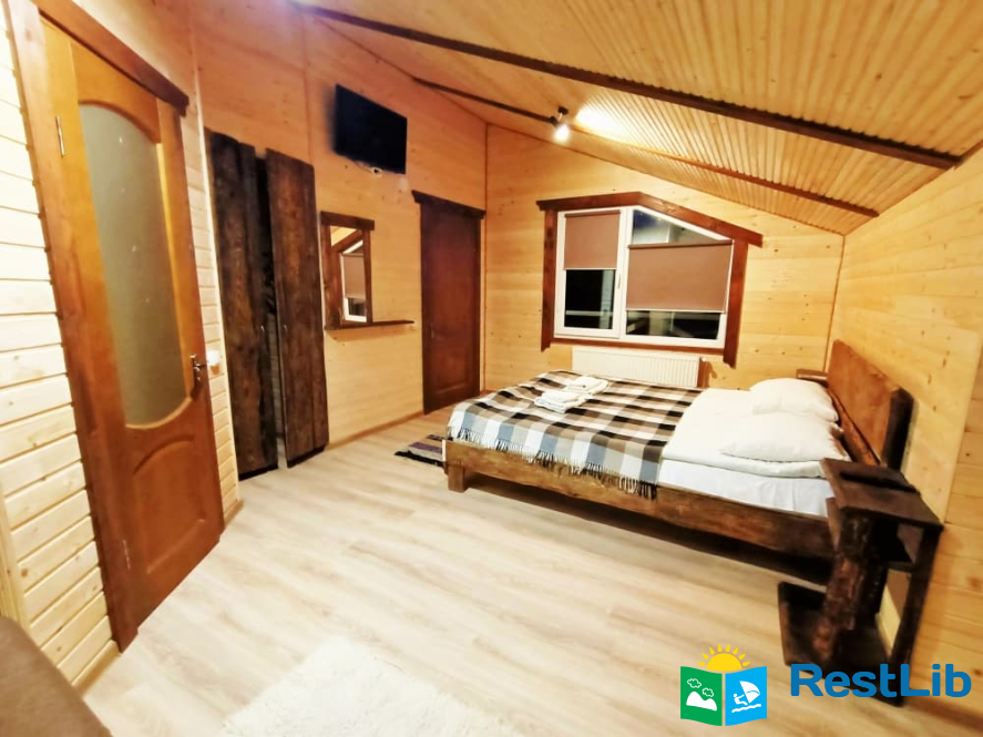 На другому поверсі - 2 двомісні номери з виходом на балкон, в кожному - двоспальне ліжко, розкладний диван, комплект меблів, телевізор, санвузол (туалет, умивальник, душ, фен).