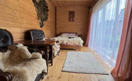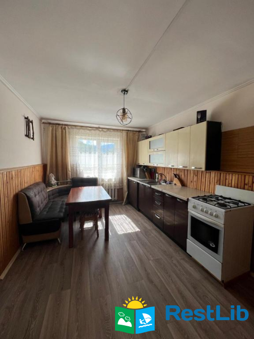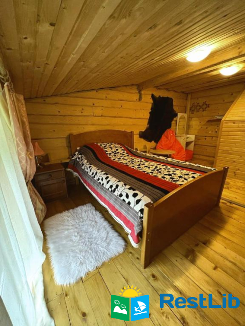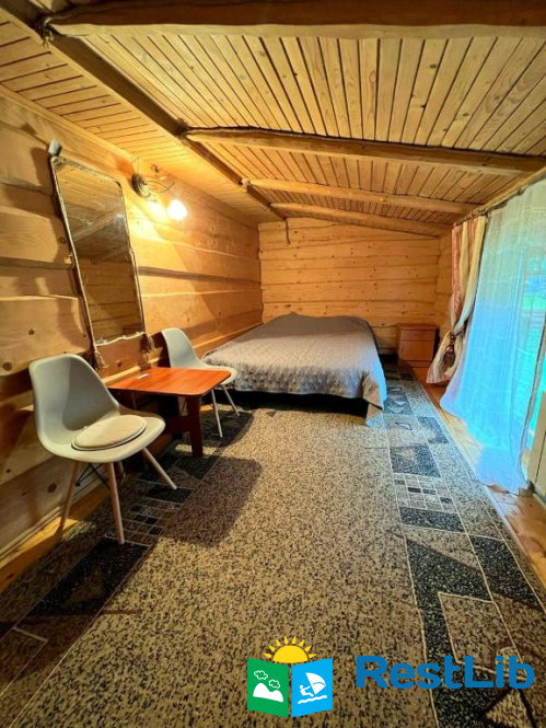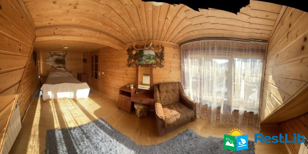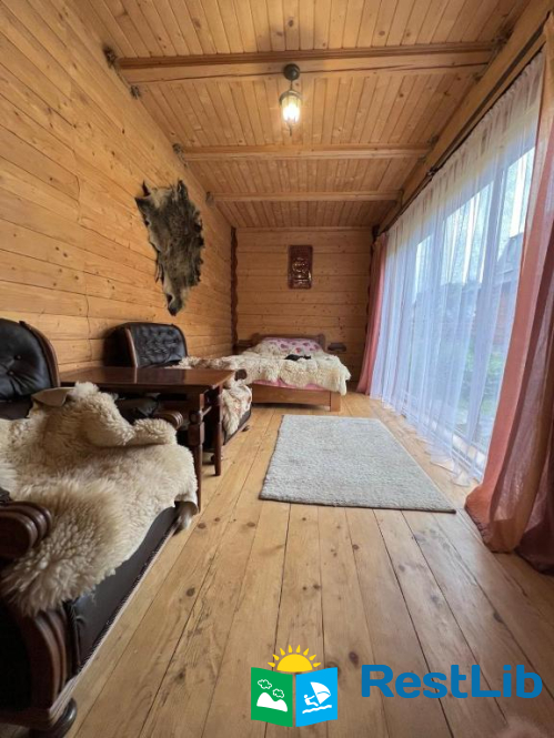 На першому поверсі — кухня (газова плита, мікрохвильова піч, холодильник, електрочайник, необхідний посуд, мийка, обідній стіл); вітальня (стіл зі стільцями, розкладний диван, телевізор); 2 двомісні кімнати (в одній — двоспальне ліжко, шафа для одягу, телевізор, вихід на терасу, в іншій — двоспальне ліжко, полиці для одягу); санвузол (душова кабіна, туалет, біде, умивальник, пральна машина).