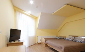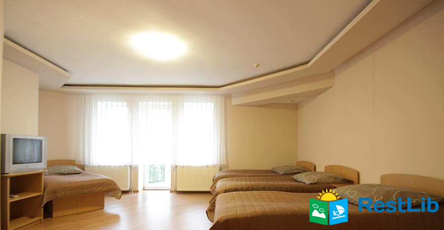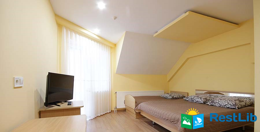 двоспальне та односпальне або 3 односпальні ліжка, шафа для одягу, телевізор, санвузол. Деякі номери мають вихід на балкон.