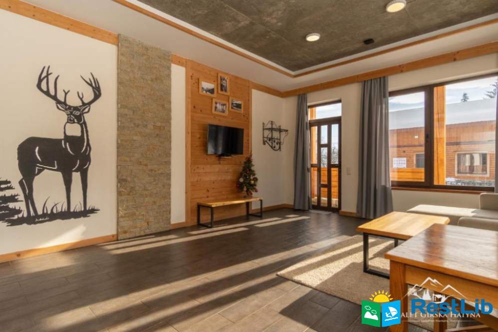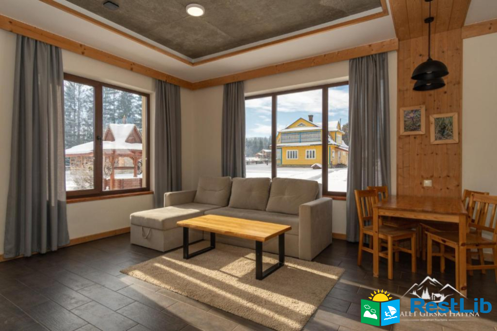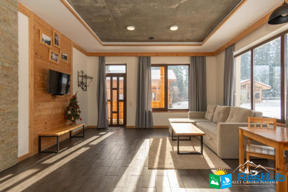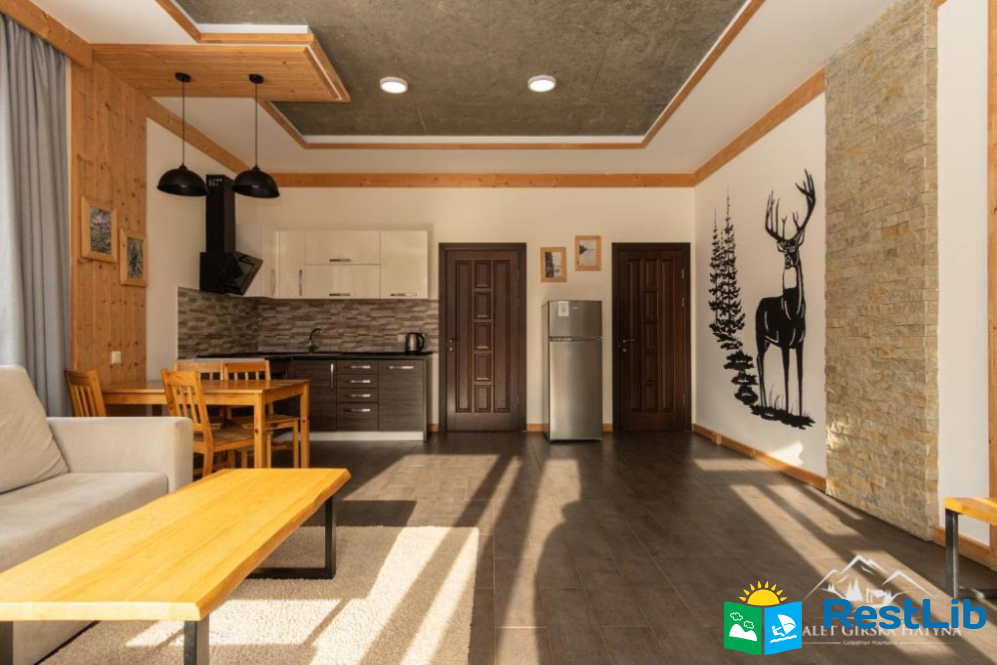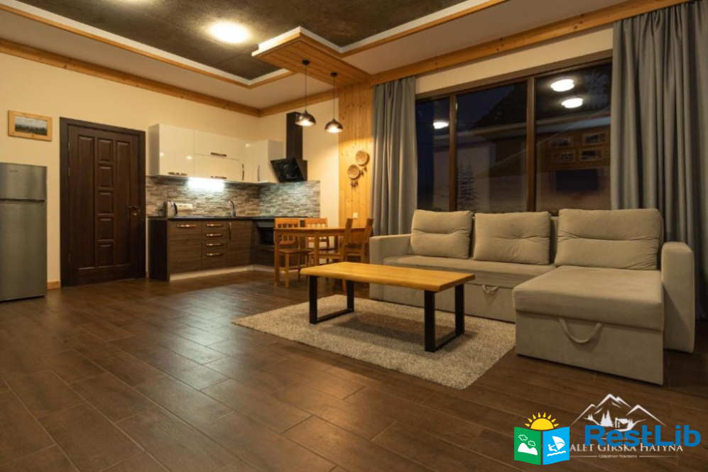 В усіх наших апартаментах є диван, лаундж зона, телевізор, обладнана кухня з обідньою зоною й окрема ванна кімната з феном.