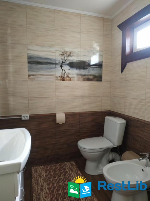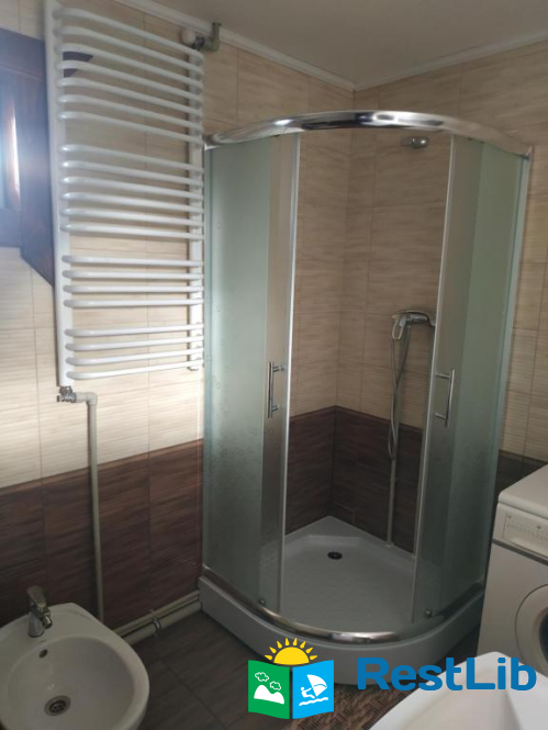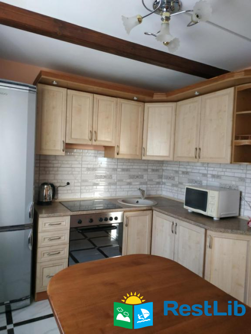 На першому поверсі є кухня укомплектована для приготування їжі, холодильник, мікрохвильова, чайник та весь необхідний посуд. Санвузол та кімната з розкладним диваном та додаткове спальне місце.