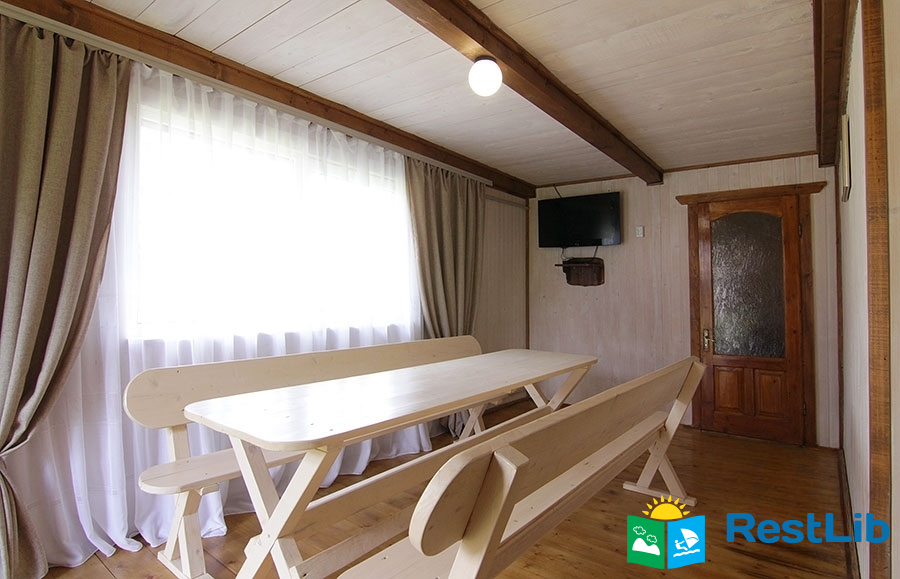 На першому поверсі — хол (стіл з лавами, телевізор); кухня (електрична плита, кухонне вогнище, холодильник, електрочайник, посуд, мийка, обідній стіл);