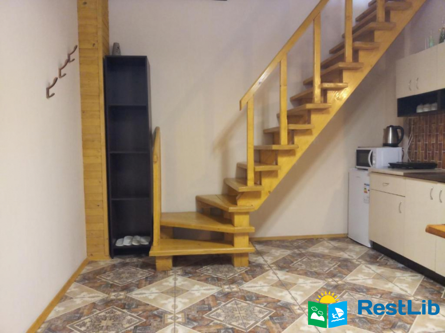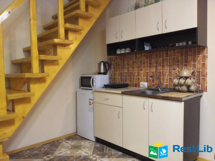 На першому поверсі велика вітальня поєднана з кухнею, обідній стіл, зона відпочинку, а також уся необхідна техніка для самостійного приготування їжі та напоїв.