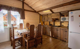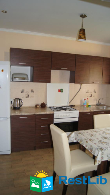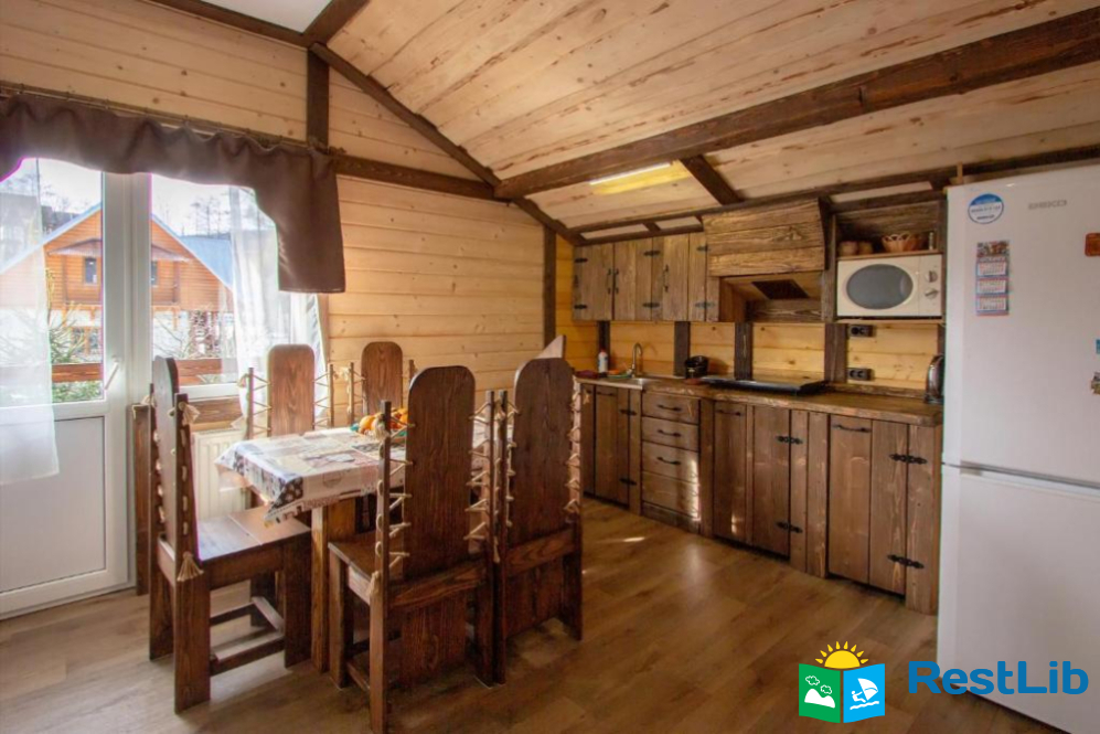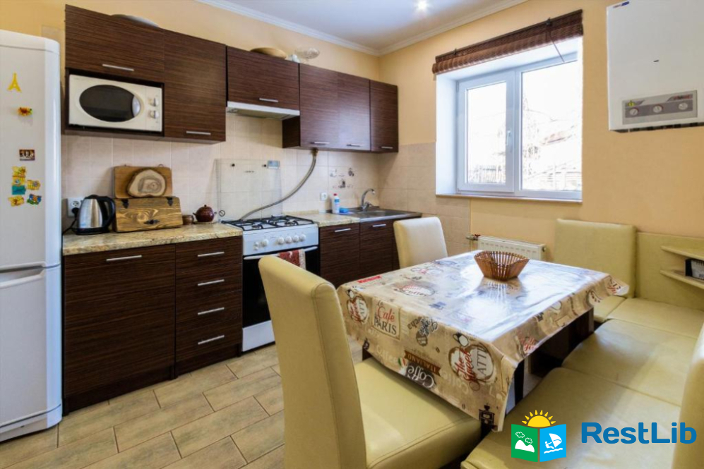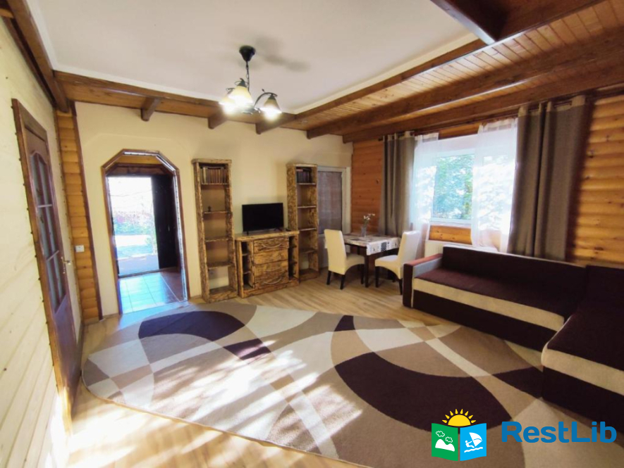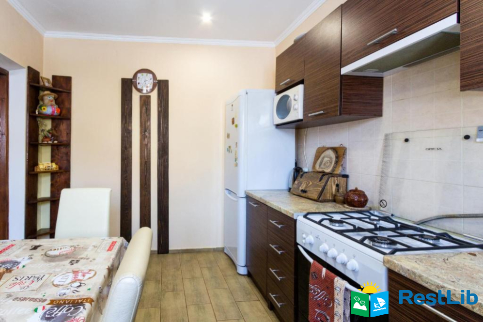 Відпочинковий зал (мягкий куток,двоспальні ліжка,smart-ТВ), кухня-їдальня (кухонна стінка, холодильник, мікрохвильова піч, газова плита з духовкою, стіл, набір посуду).