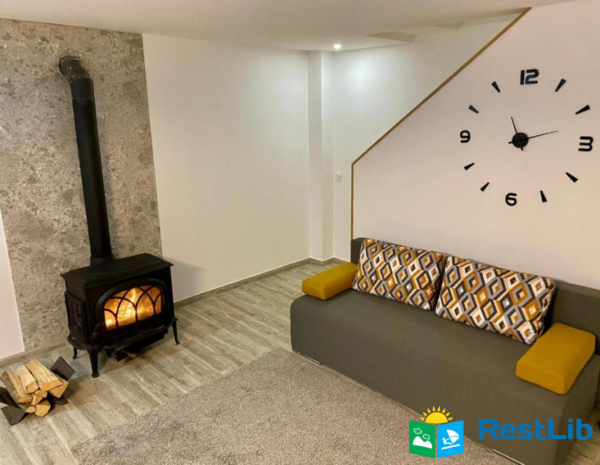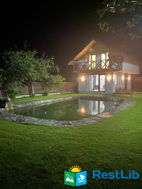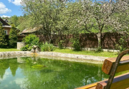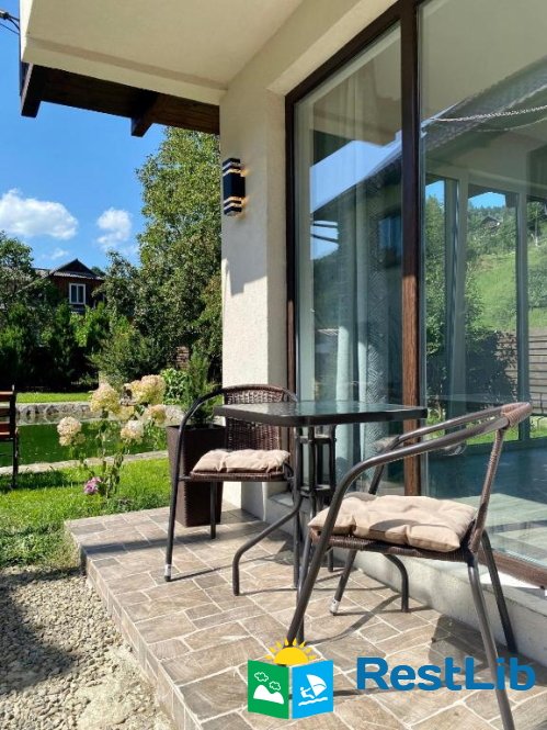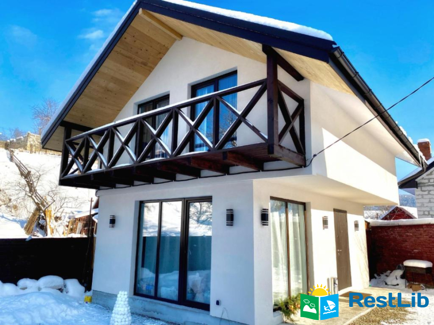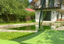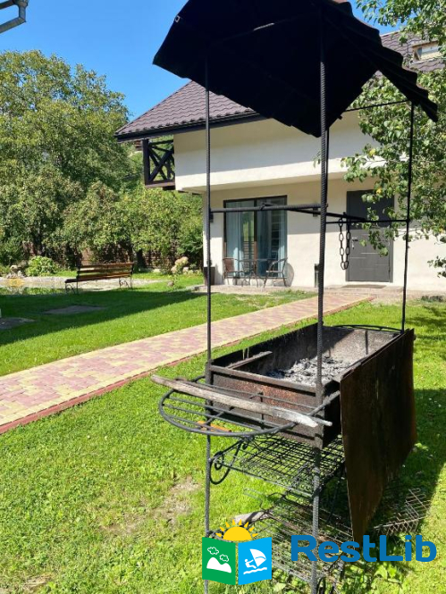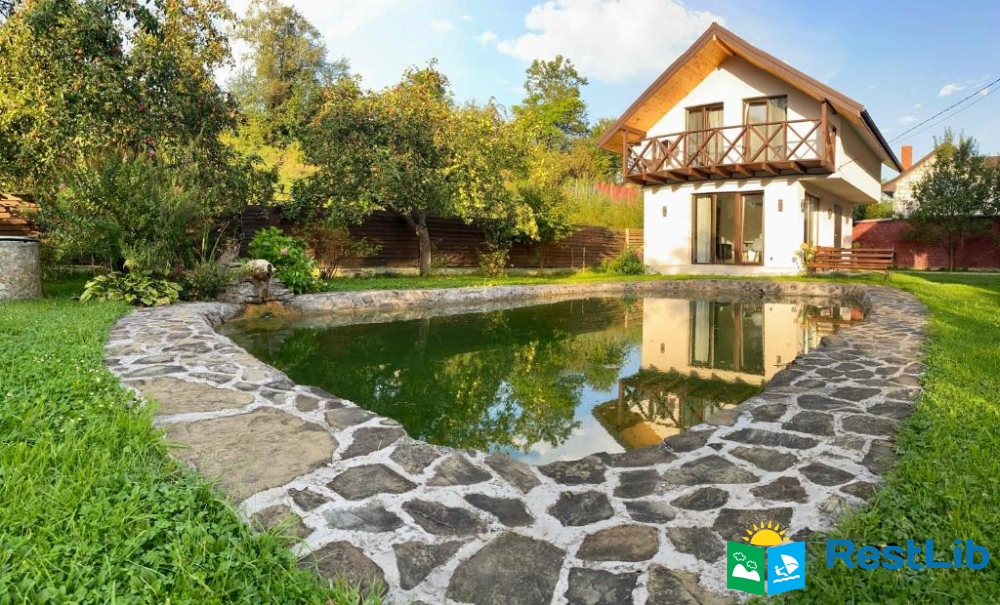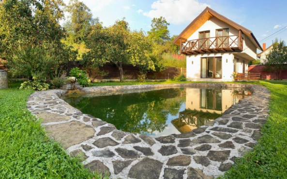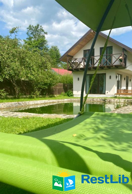 Будинок з панорамними вікнами на власне озеро, в якому плаває риба (Карпатська форель), та видом на гори. В будинку є все необхідне для комфортного відпочинку.