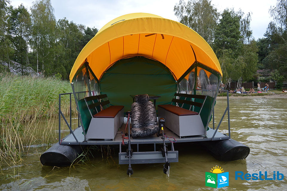 На плоті може розташуватися 8-10 під накриттям, на лавках за столом. Також на передній частині плоту можна встановити додатково шезлонги.