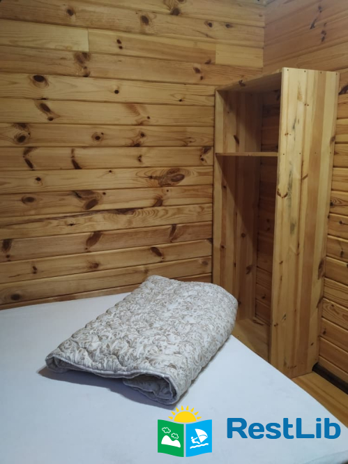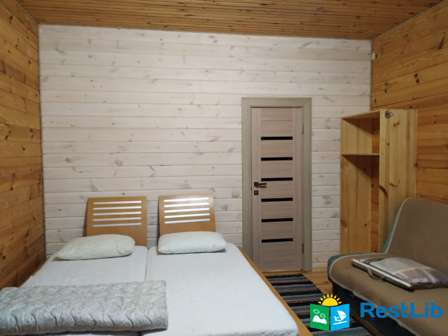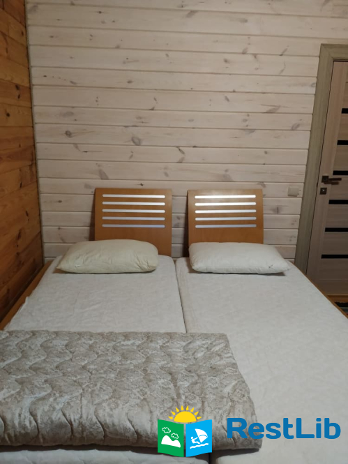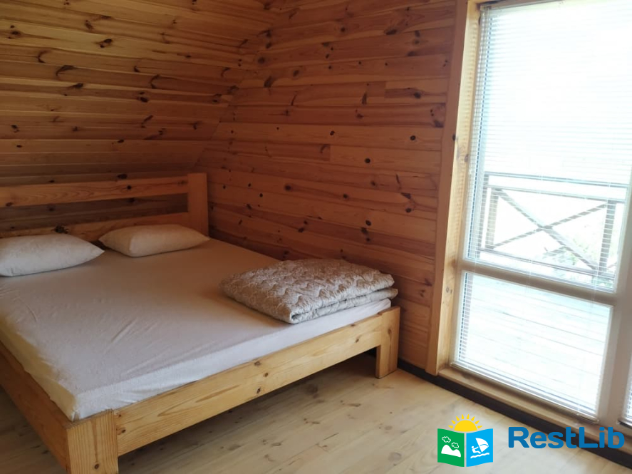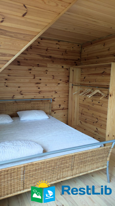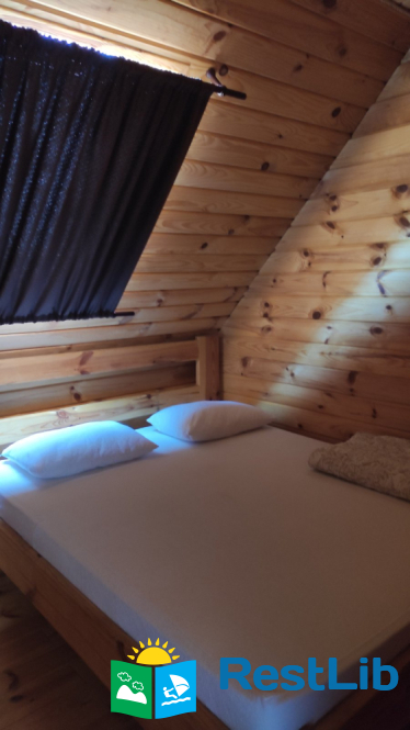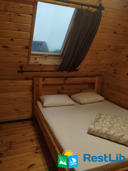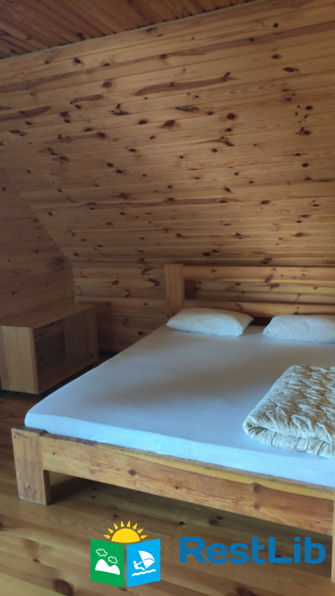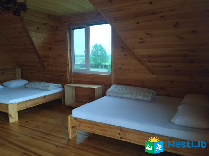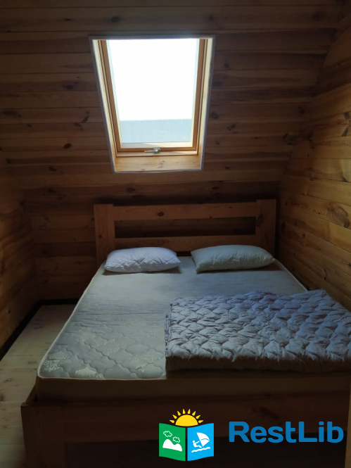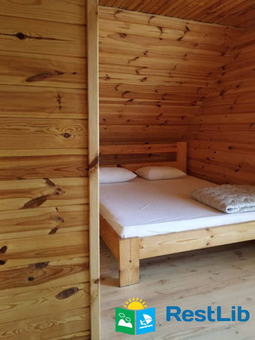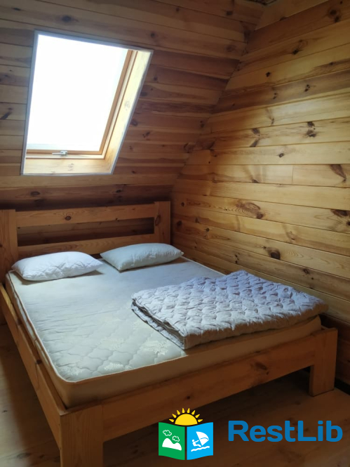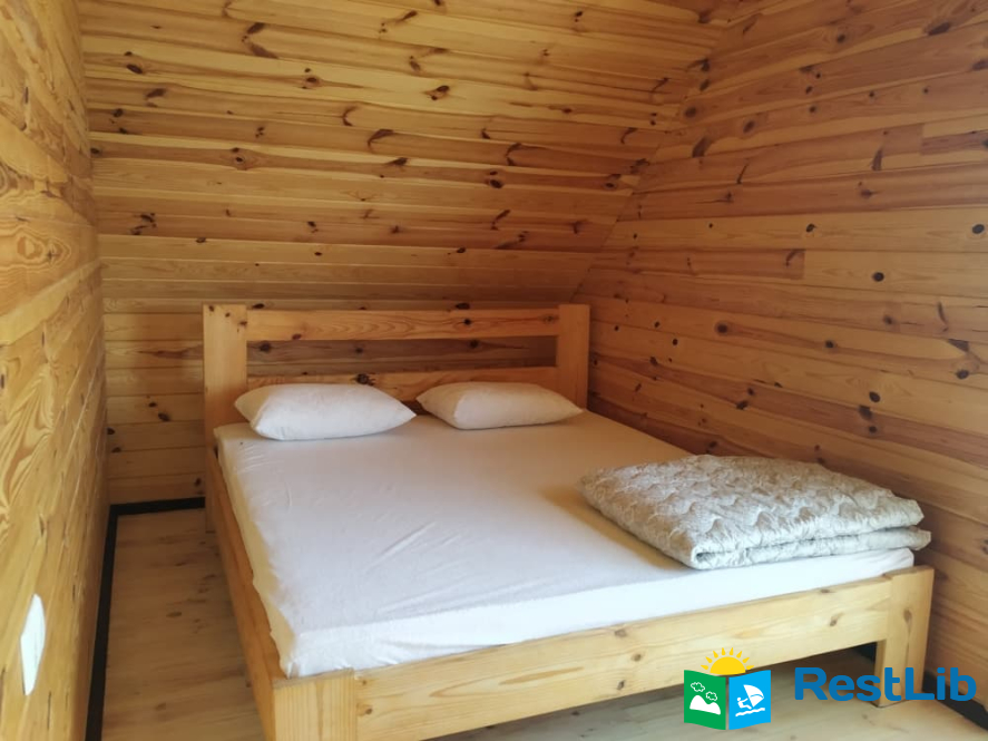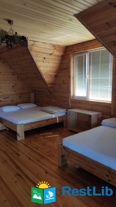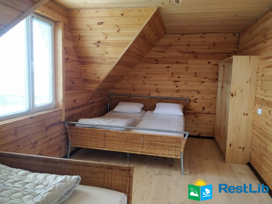 - 2 двомісні (в кожній велике дерев'яне ліжко з ортопедичними матрацами, подушками та ковдрами), полички для речей.