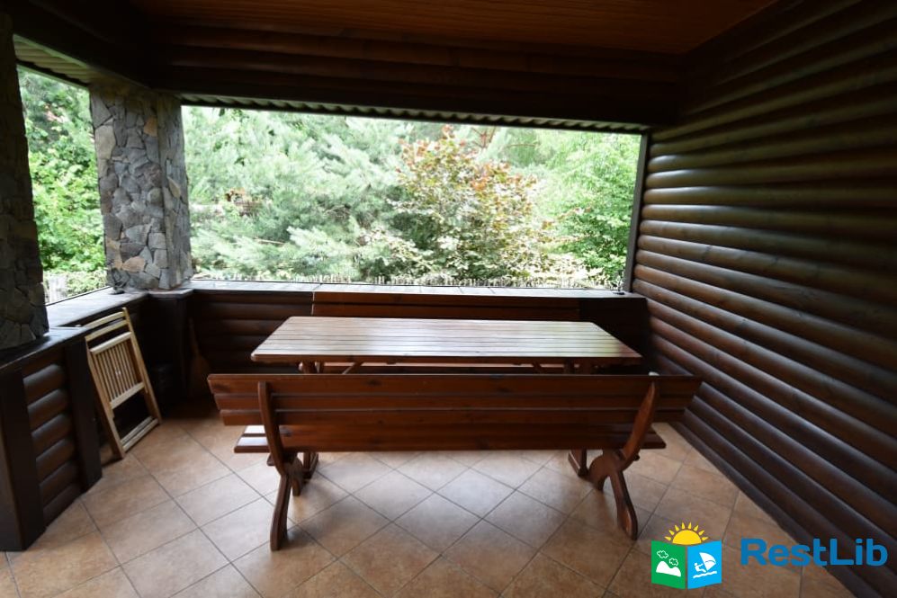 Біля входу в котедж крита літня тераса зі столом та лавочками.