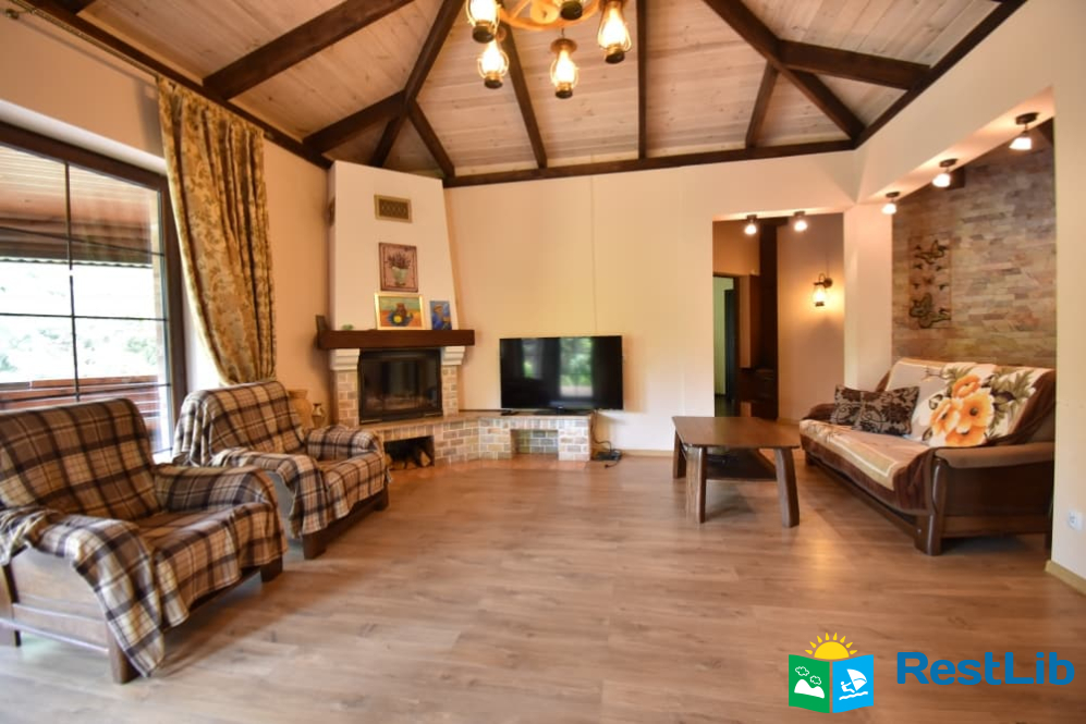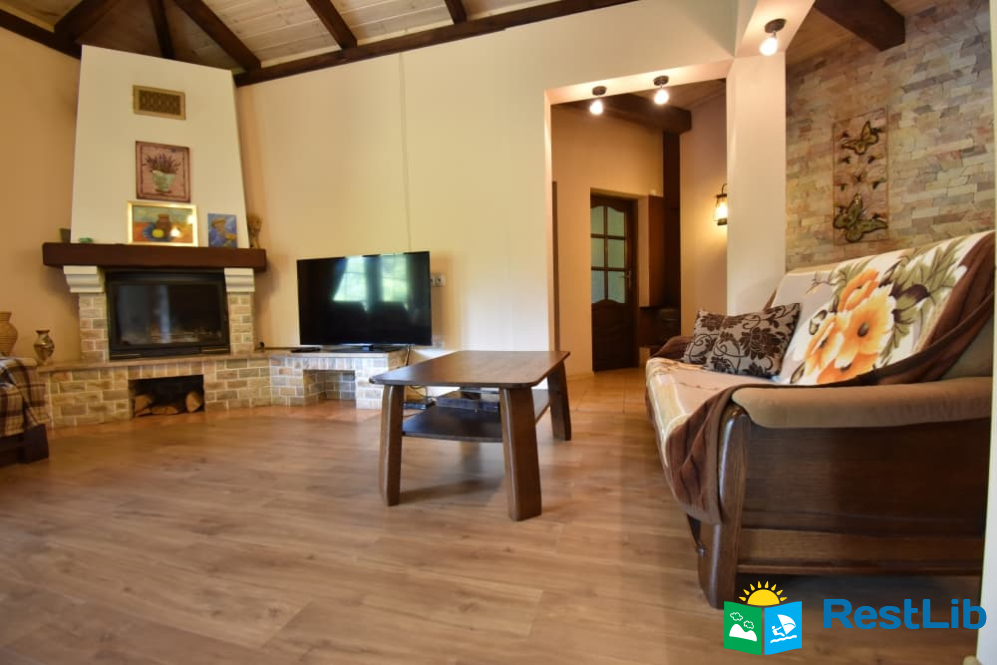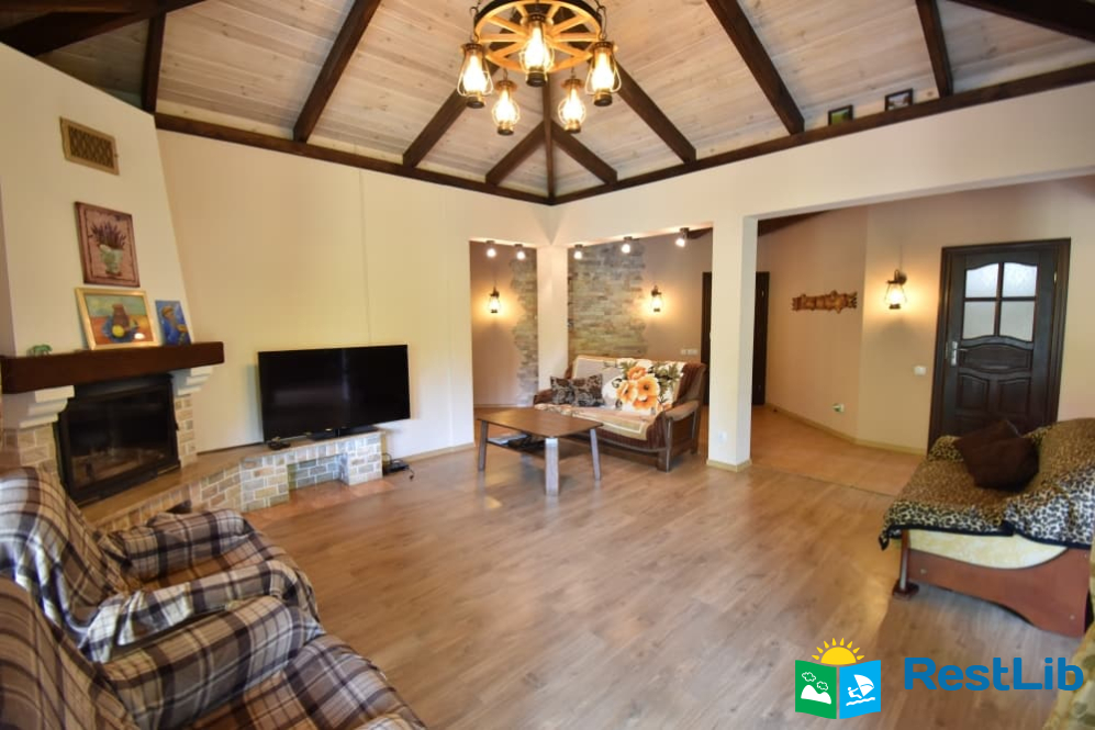 Просторий хол з двома розкладними диванами, журнальним столиком, ТБ, кріслами та каміном.