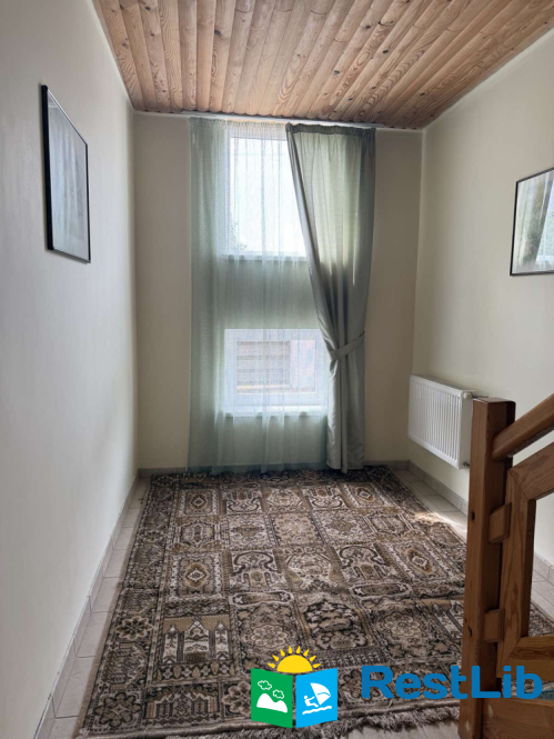Вітальня з диваном , 5 чотиримісних номерів (2 на першому поверсі та 3 на другому). В кожному номері: двоспальне + двоярусне ліжко (або двоспальне ліжко + розкладний диван), своя кухня (кухонний гарнітур, техніка, посуд), телевізор, шафа, вентилятори, обідній стіл зі стільцями. (на другому поверсі вихід на балкон).