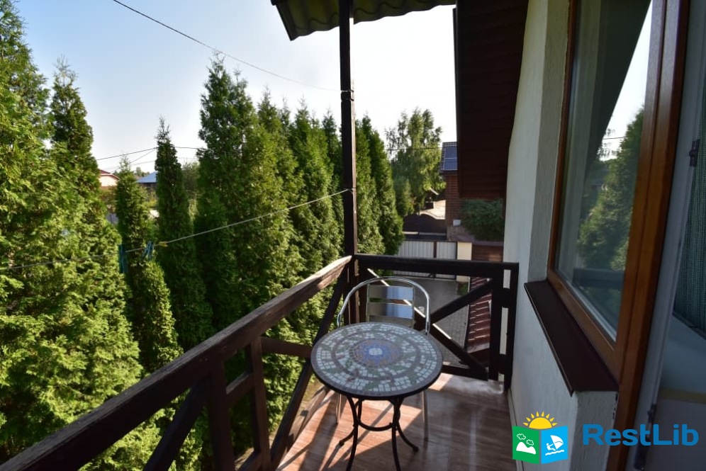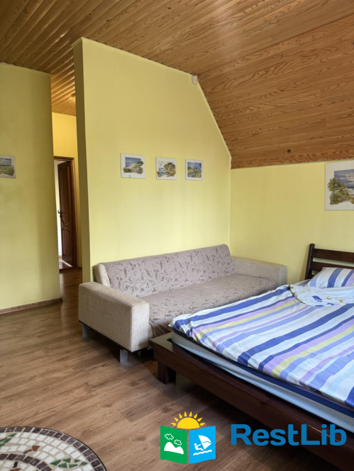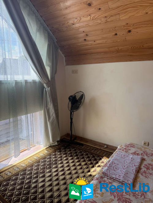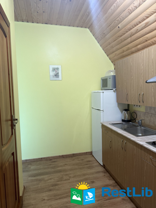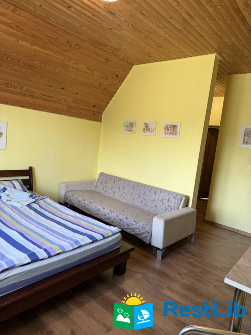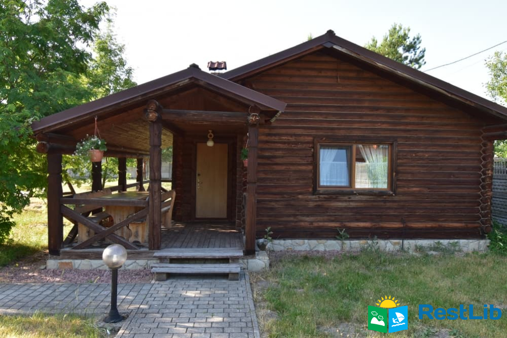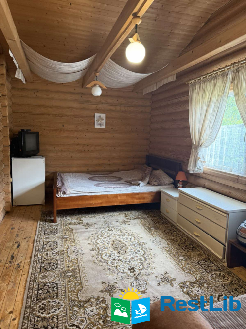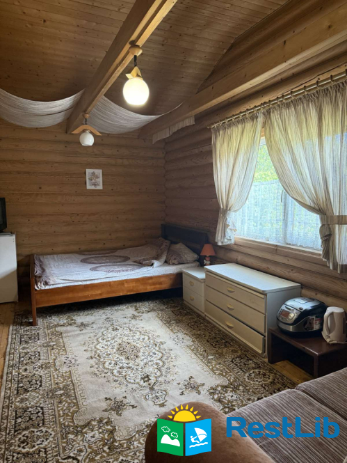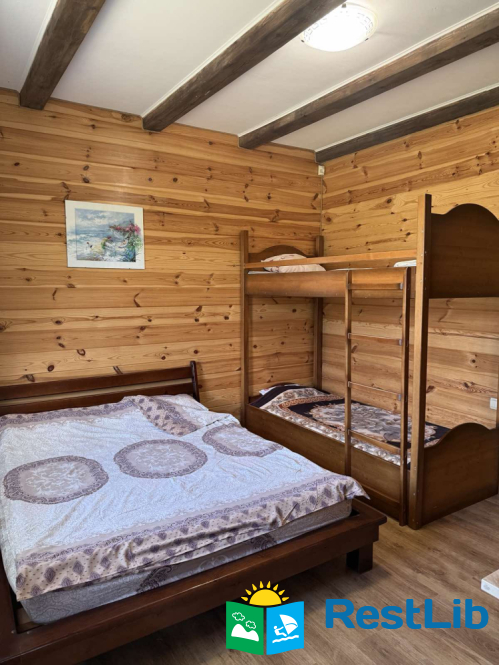 В будинку: двоспальне ліжко + розкладний диван, вентилятор, телевізор, холодильник, комод, тумбочка. Санвузол (душ, туалет, умивальник). В будинку баня з басейном. Кухня загальна на території. Біля входу в будинок крита тераса. В будні дні можливі знижки.