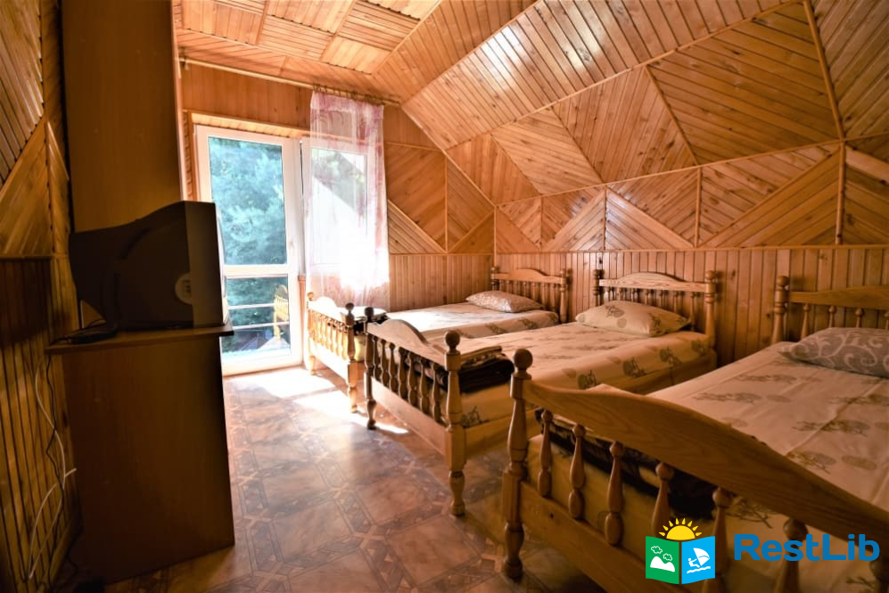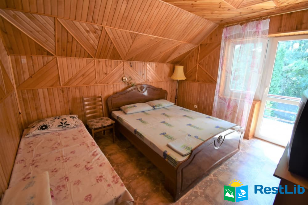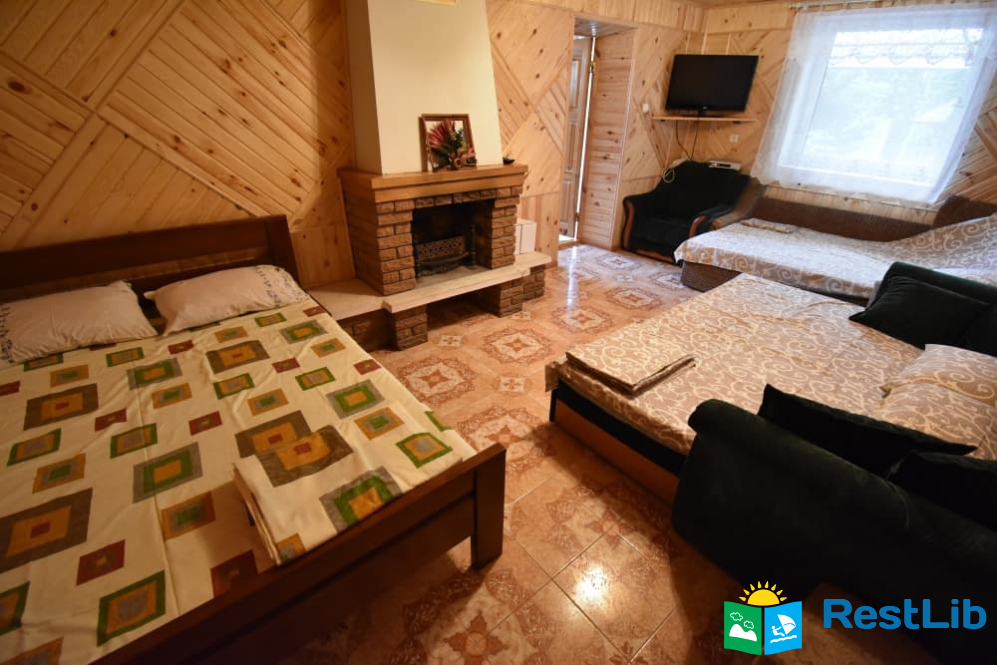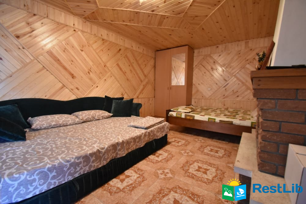 На першому поверсі: кухня з усім необхідним посудом для 15 осіб, спальня на 6 осіб з каміном (двоспальне ліжко + 2 розкладних дивани, шафа, ТБ, м'яке крісло), санвузол (душ, туалет, умивальник). На другому поверсі: коридорчик з м'яким кріслом і трюмо, спальня для 3 осіб (двоспальне + односпальне, вихід на балкон), спальня для 3 осіб (3 односпальних ліжка, вихід на балкон, шафа, ТБ, тумба), спальня для 3 осіб (двоспальне + односпальне, шафа, ТБ, тумба).