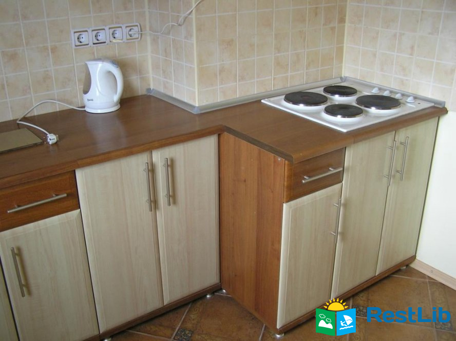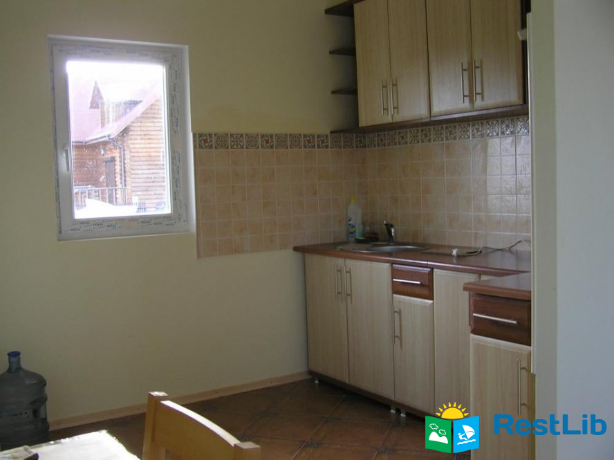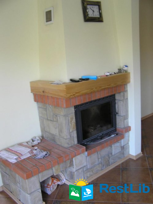 На першому поверсі розташована кухня (є холодильник, плита, свч, чайник, кухонний інвентар), ванна кімната ( туалет, душова кабіна, пральна машина, бойлер, фен) та 3 кімнати, кожна вмебльвана і облаштовано 2 спальним ліжком/диваном. Одна кімната прохідна, в ній знаходиться камін та телевізор.