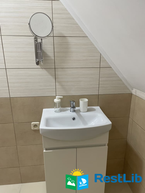 Одні дворівневі апартаменти. На першому поверсі: вітальня з обіднім столом, диваном, стелажем з полицями, холодильником; санвузол (умивальник, душ, туалет). На другому: два двоспальних ліжка, розкладний диван, комод, вихід балкон.