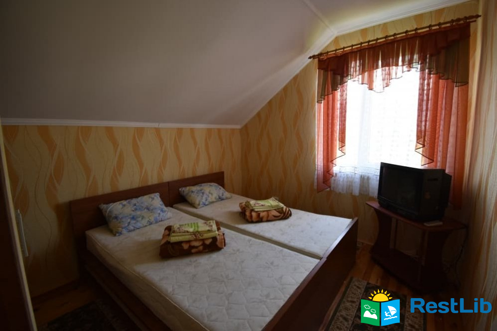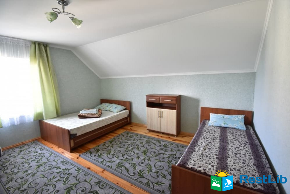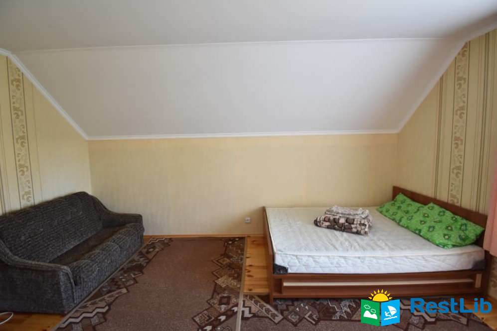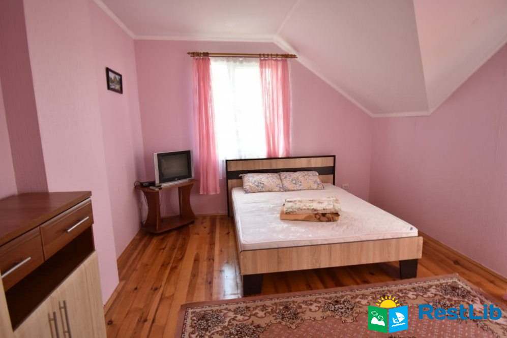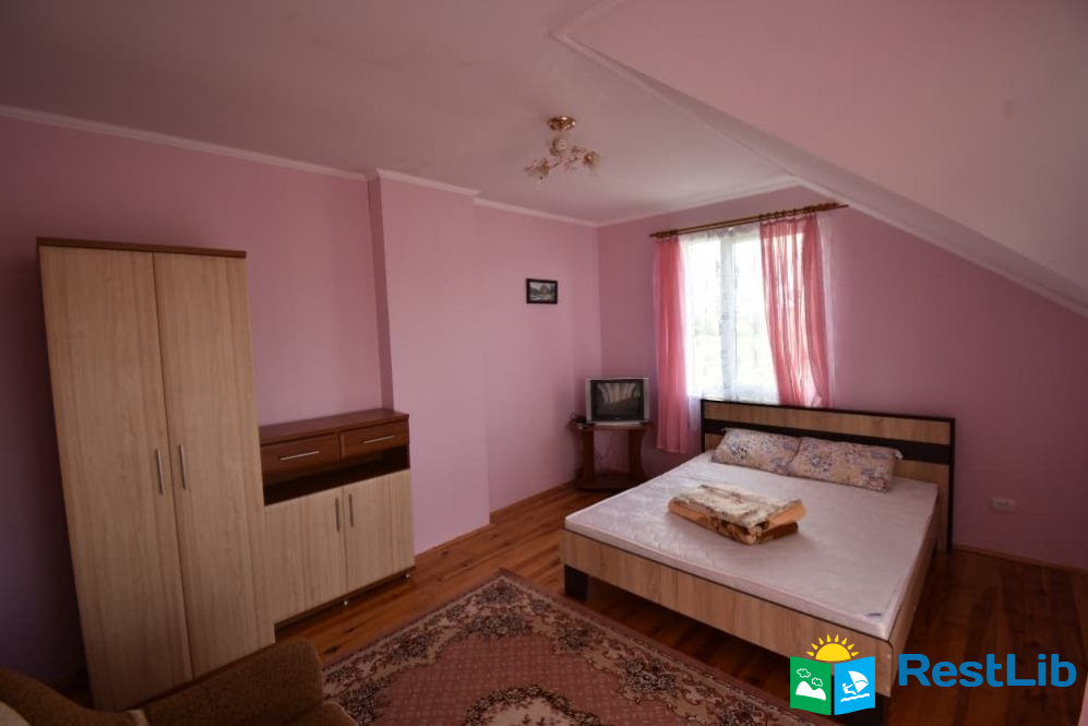 Перший будинок: на поверсі дві кімнати одна 2-ох місна, друга 3-ох - 4-ох місна (ліжко 160см і 2 розкладних крісла.) В кожній кімнаті телевізори, а також на поверсі кухня весь посуд електроплита, електрочайник, холодильник,  душ та туалет.