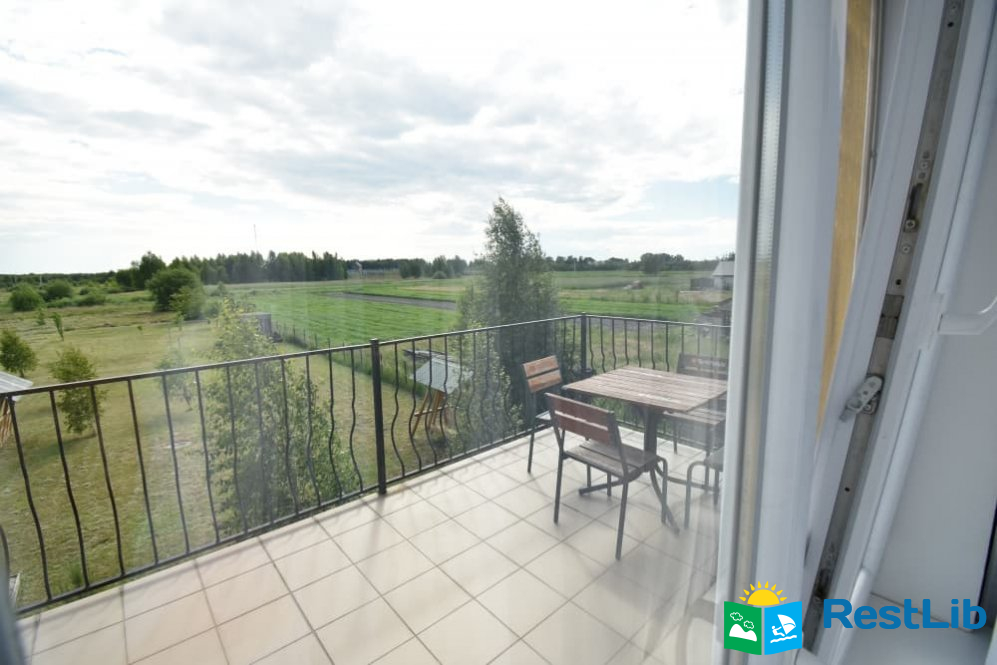 На  другому поверсі є три 3-ох кімнатні номери, (душ, туалет на поверсі). В кожній кімнаті є 2-ох спальне ліжко 140 см та 1-о спальне 90 см, в кожній кімнаті є холодильник. 2 кімнати з великими терасами, четверта кімната може бути 5-ти місна 2-ох, 1-о спальне ліжко і софа. Кімнати всі великі 20-25 кв.м. є кухня, електроплита та електрочайник, посуд. В холі телевізор.  Хол з балконом.