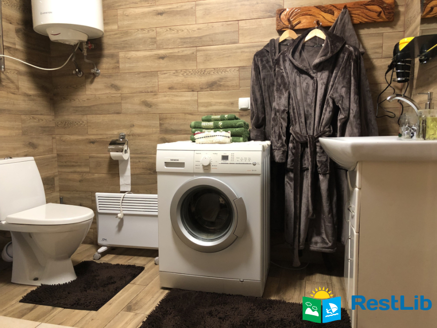 Санвузол: душова кабіна, унітаз, умивальник, пральна машина, фен, рушникосушка, (кількість рушників - 2 на особу, заміна рушників по потребі), Косметичні засоби,тапки, халати - безкоштовно .