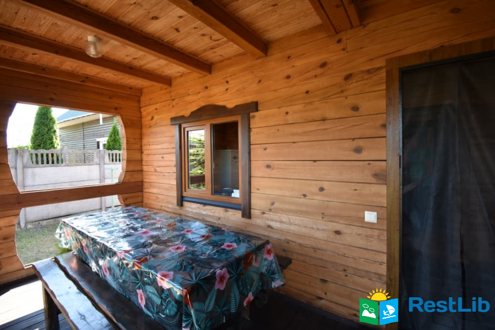 При вході в котедж є крита тераса з столом та лавками.