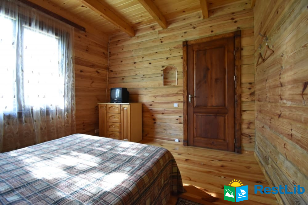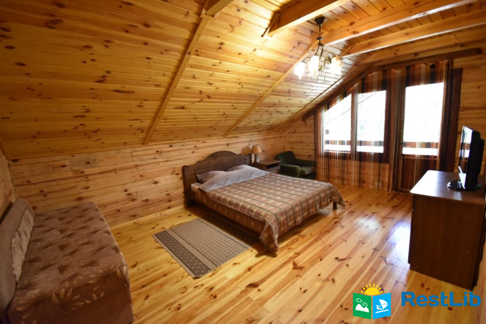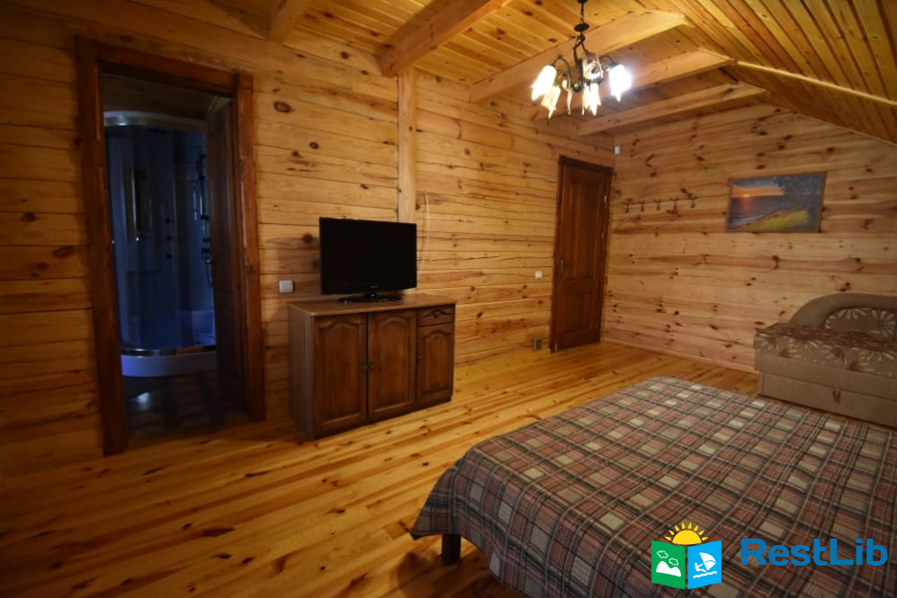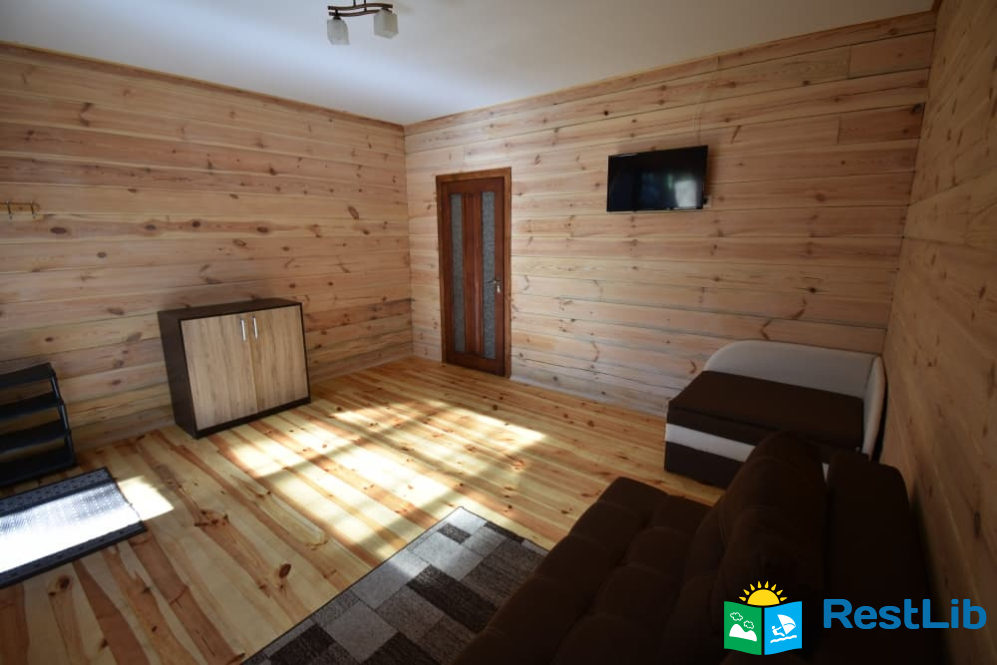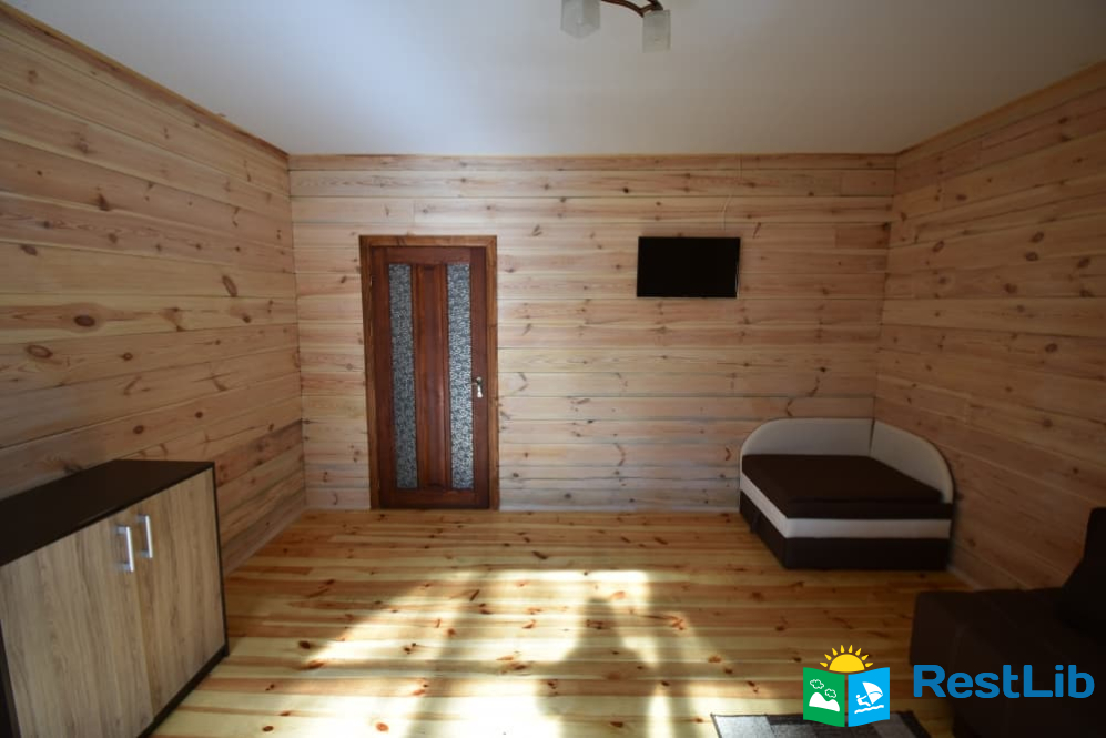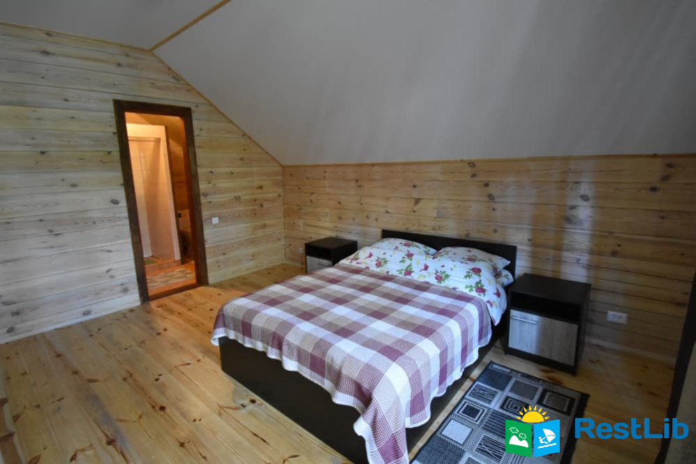 Двоповерховий будинок на 3 п'ятимісні кімнати. В кожному номері санвузол. Номери двокімнатні : вхід до кожного номеру окремий з вулиці, вітальня з розкладним диваном та кріслом, телевізор, двомісна спальна кімната (двоспальне ліжко). Кухня на першому поверсі : кухонний гарнітур, електрична плита, духовка, 2 холодильника з морозильною камерою, витяжка, мийка, посуд, електричний чайник). На першому поверсі обідній стіл та стільці, на другому поверсі тераса з столами та стільцями.