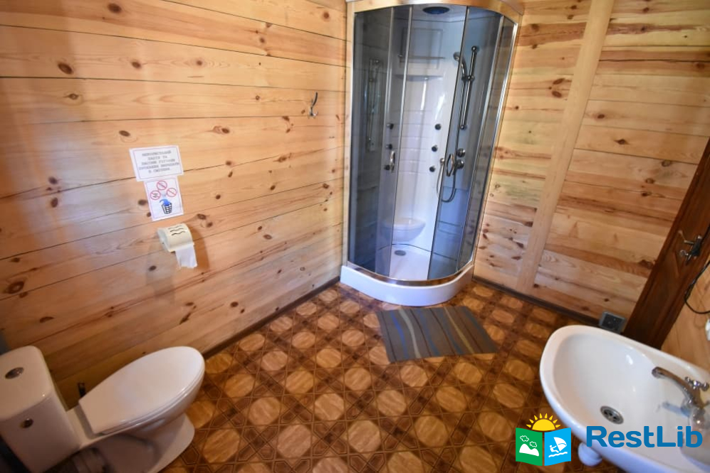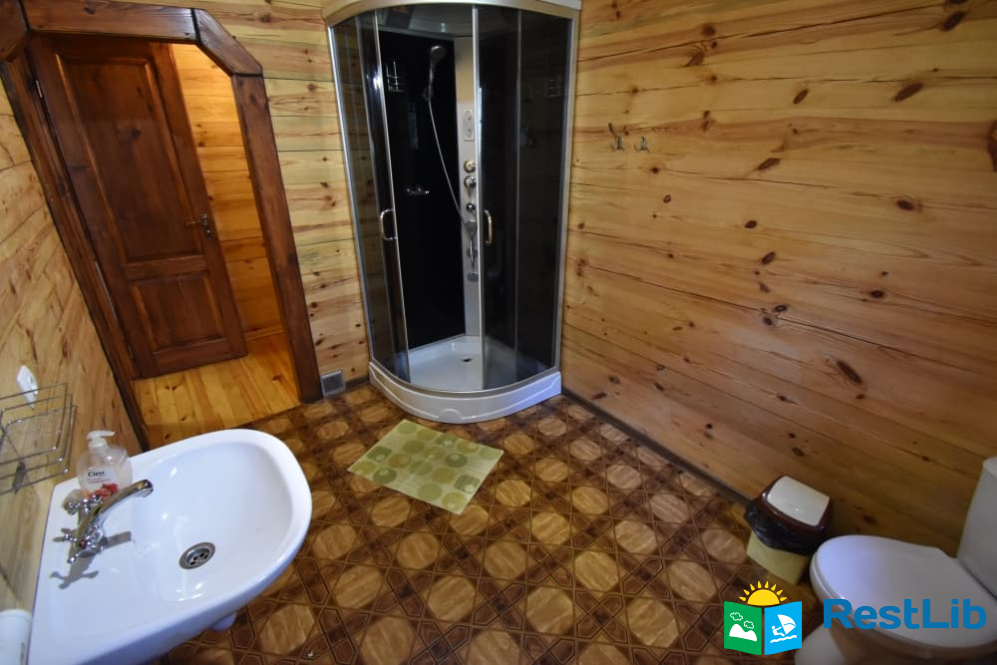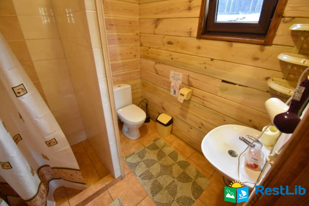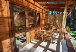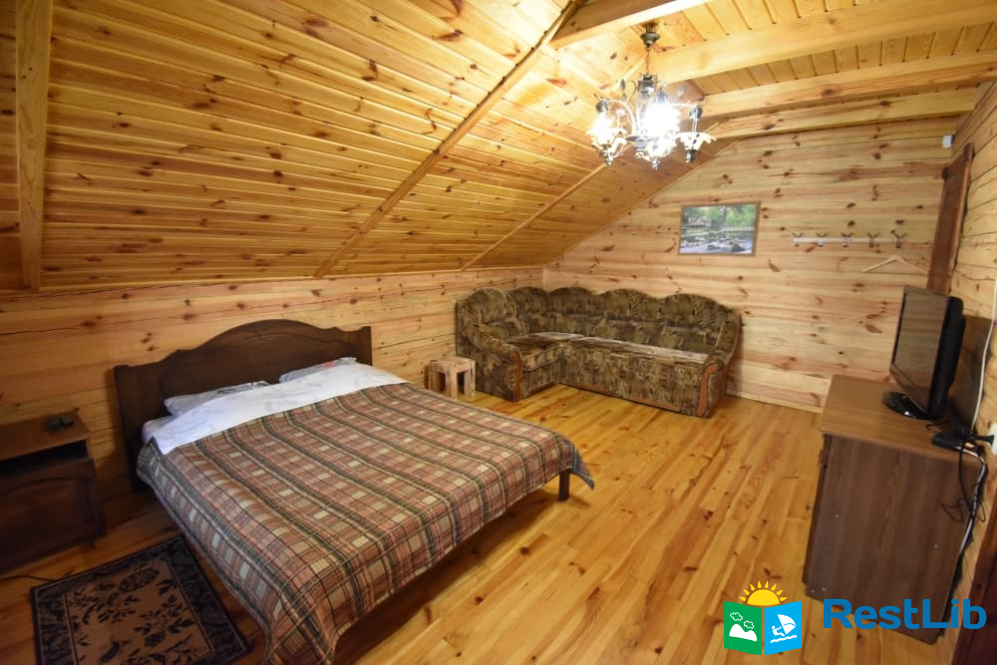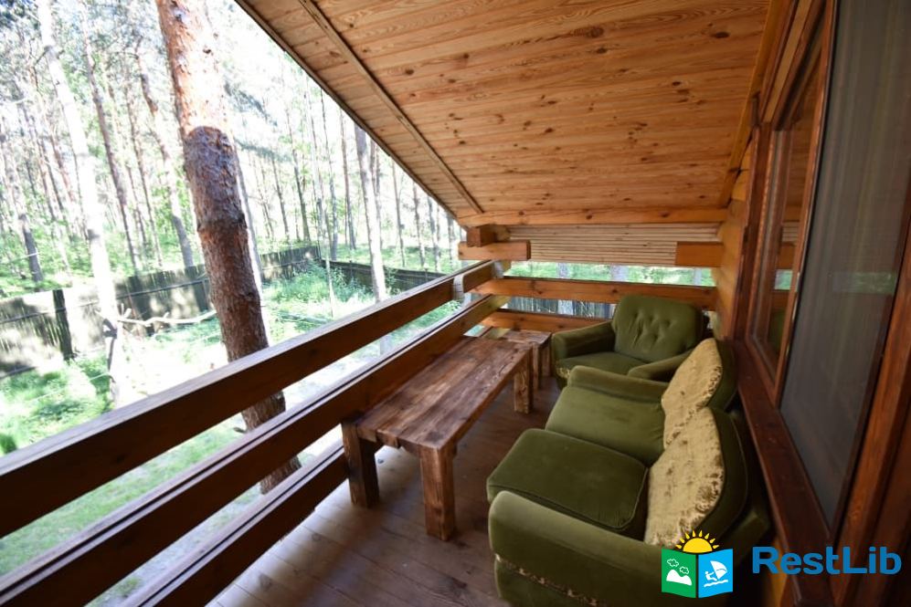Двоповерховий будинок на 3 п'ятимісні кімнати. В кожному номері санвузол. Номери двокімнатні : вхід до кожного номеру окремий з вулиці, вітальня з розкладним диваном та кріслом, телевізор, двомісна спальна кімната (двоспальне ліжко). Кухня на першому поверсі : кухонний гарнітур, електрична плита, духовка, 2 холодильника з морозильною камерою, витяжка, мийка, посуд, електричний чайник). На першому поверсі обідній стіл та стільці, на другому поверсі тераса з столами та стільцями.